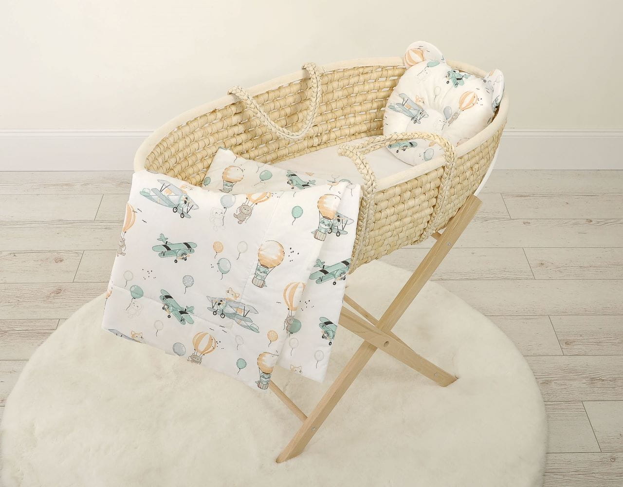 Komplet pościeli składa się z lekkiej kołderki z antyalergicznym wypełnieniem oraz profilowanej poduszeczki. Kołderka zapewnia optymalny komfort cieplny, jednocześnie nie obciążając dziecka, dzięki czemu nadaje się na każdą porę roku. Profilowana poduszeczka wspiera prawidłowe ułożenie główki maluszka, co sprzyja zdrowemu rozwojowi i zapobiega deformacjom. Całość jest łatwa w utrzymaniu czystości, co ułatwia rodzicom codzienną pielęgnację. To funkcjonalny i estetyczny dodatek do kosza Mojżesza, gwarantujący dziecku spokojny i bezpieczny sen.