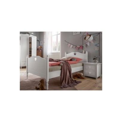 Centralnym punktem pokoju jest łóżko Bella 90x200 ustawione prostopadle do ściany z oknem. Wysokie szczyty z delikatnie falowaną linią i wyciętym serduszkiem tworzą przytulne tło dla poduszek. Łóżko nakryte jest jasną pościelą, a na wierzchu leżą miękki koc z frędzlami i poduszki w ciepłych odcieniach różu i beżu. Dzięki temu strefa snu wygląda komfortowo i zachęca do odpoczynku.