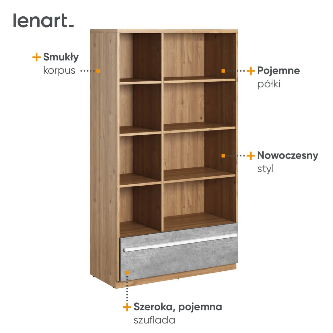 Smukły korpus, półki w kolorze drewna w kompozycji z szarą szufladą sprawiają, że regał prezentuje się nowocześnie i z łatwością dopasuje się do różnych stylów. Mebel świetnie wygląda w połączeniu z innymi bryłami z kolekcji Plano np. biurkiem, szafami lub komodami.
