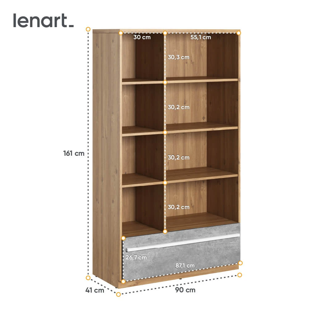 Regał 90 cm wyposażony został w szeroką, pojemną szufladę, w której komfortowo przechowasz, np. dokumenty lub drobne przedmioty.