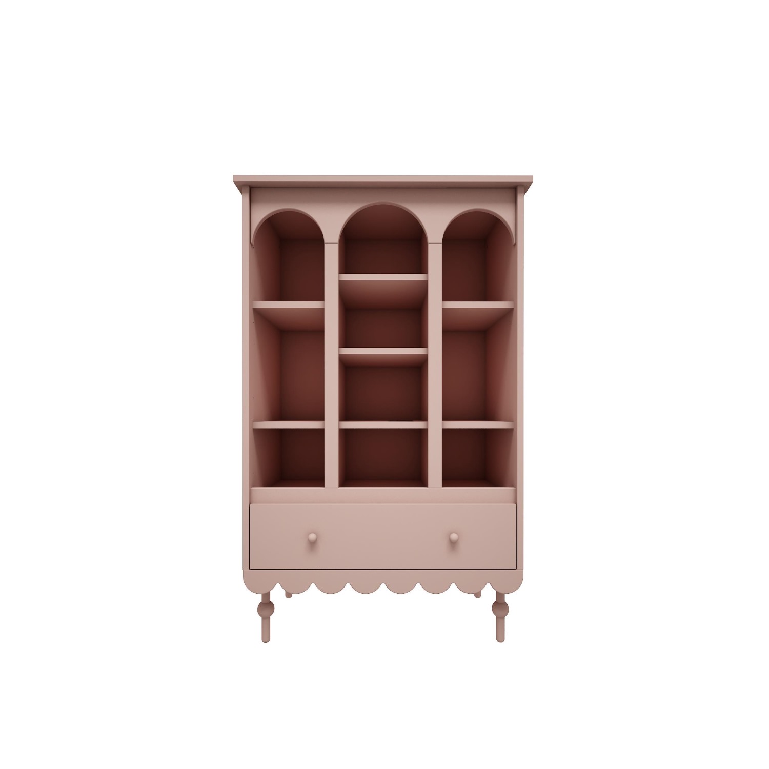 Regał Babushka różowy to uroczy regał dla dziewczynki w pastelowym kolorze róż naturalny NCS S 2020-Y80R. Otwarta forma z zaokrąglonymi wnękami i dekoracyjna „falbanka” u dołu nadają mu romantyczny, bajkowy charakter. Regał należy do kolekcji Babushka, więc bez trudu zestawisz go z innymi meblami dla dziewczynki – łóżkiem, szafą, biurkiem czy komodą w tym samym stylu.