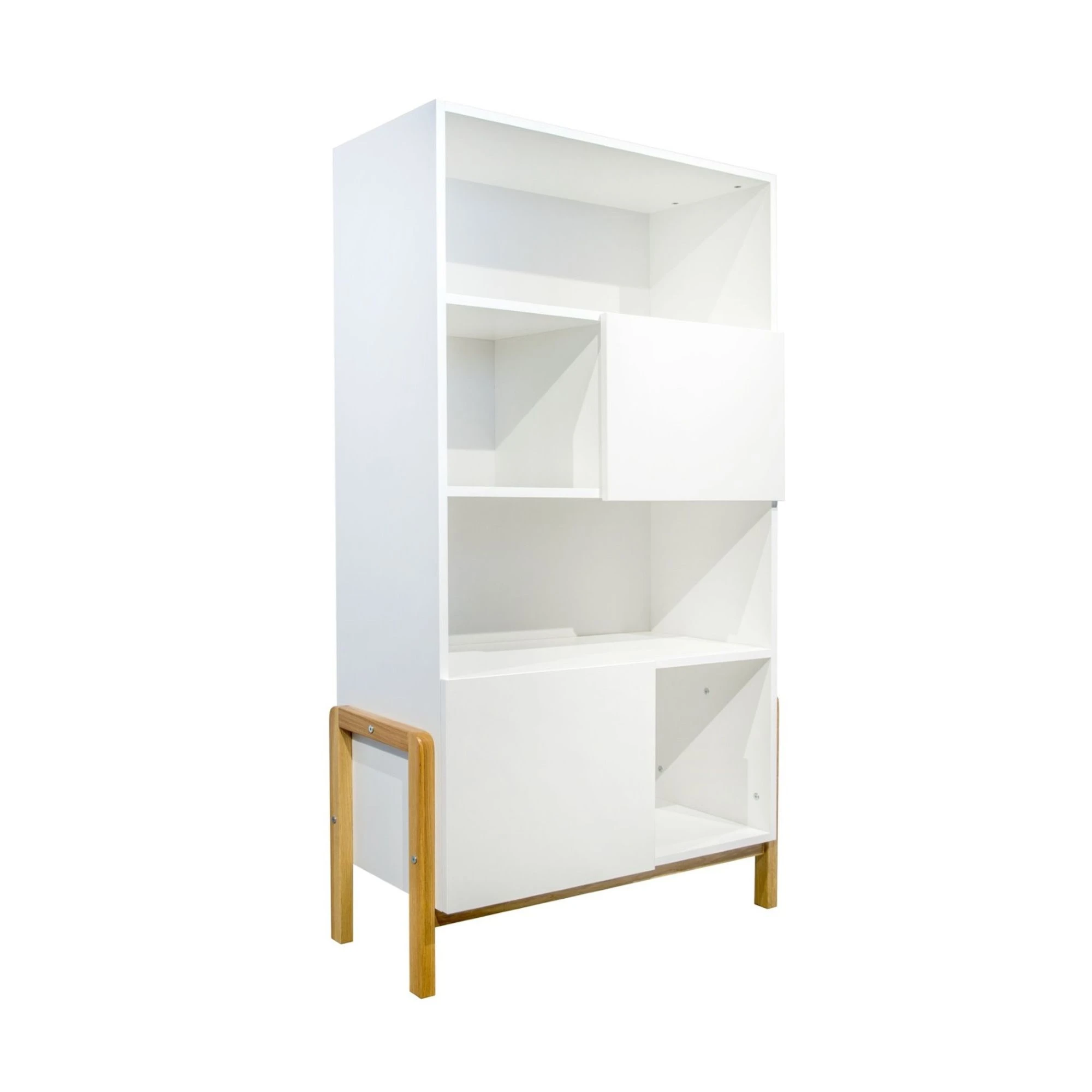 Regał wykonany jest z certyfikowanej płyty laminowanej w kolorze białym, a całość osadzono na charakterystycznych dla kolekcji nogach z lakierowanego litego drewna dębowego. Dzięki temu regał: