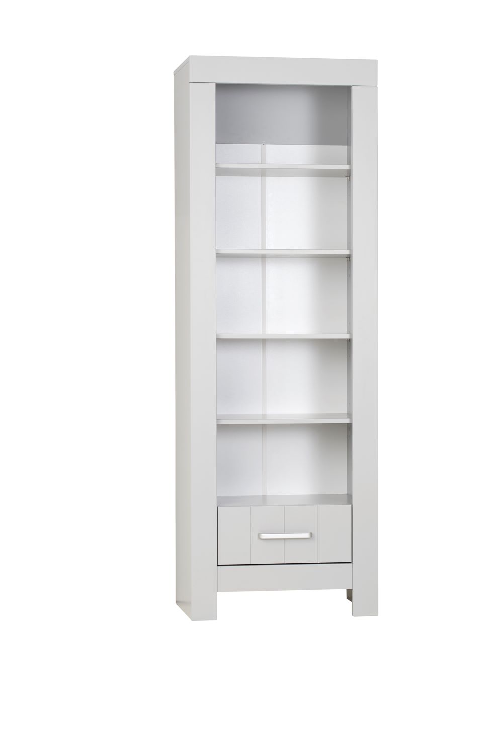 Regał dla dziecka Calmo to smukły, wysoki mebel z 4 otwartymi półkami i dolną szufladą, który świetnie porządkuje książki, zabawki i dekoracje w pokoju dziecka lub nastolatka. Dostępny w kolorze białym i szarym, lekko rozjaśnia wnętrze i pasuje do wielu stylów – od skandynawskiego po nowoczesny. W połączeniu z innymi meblami z kolekcji Calmo (łóżkiem, komodą, szafą) tworzy spójną aranżację pokoju dziecięcego.
