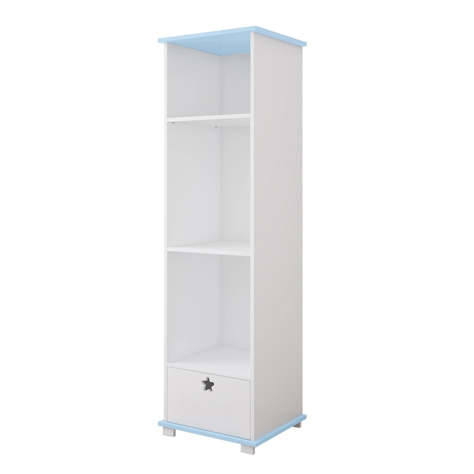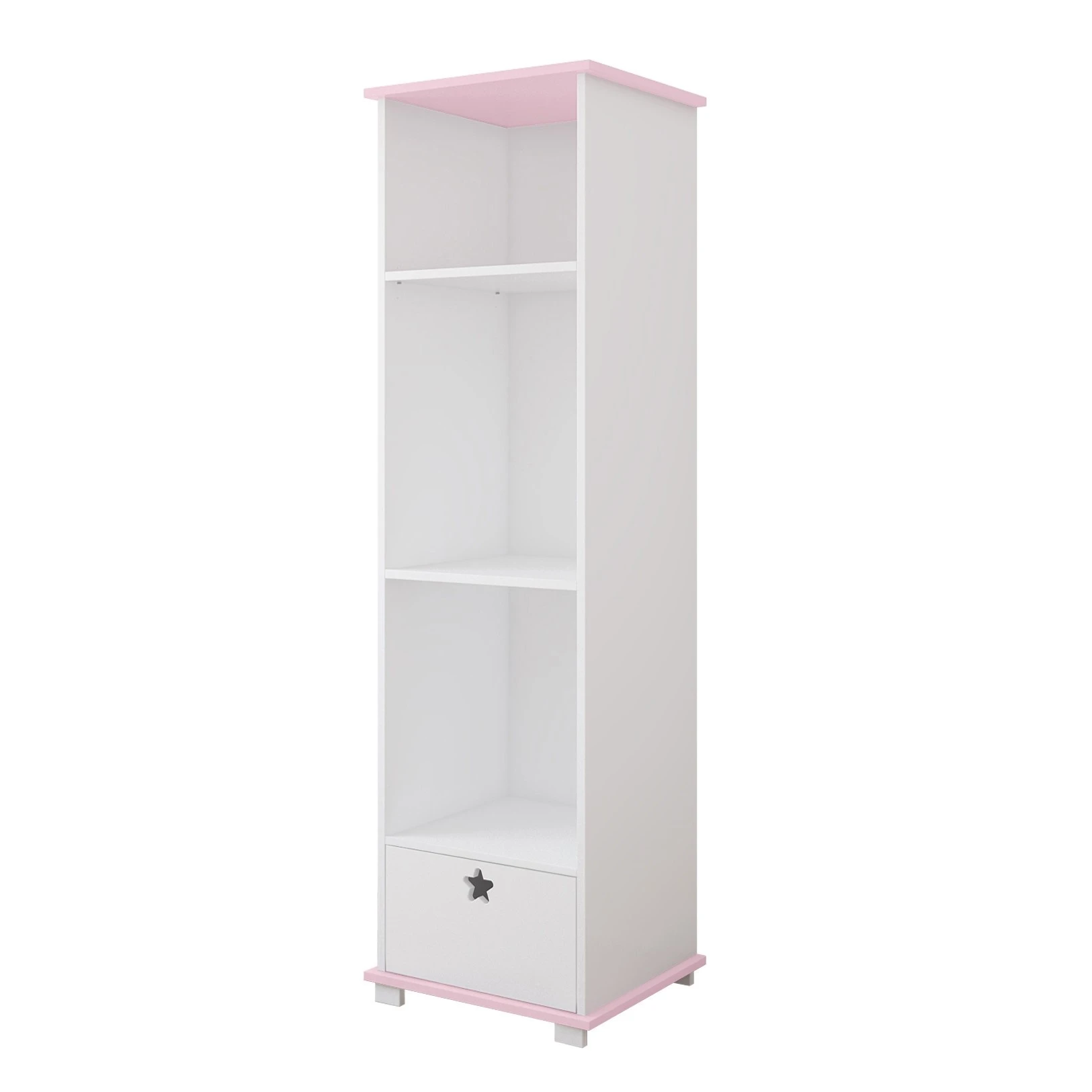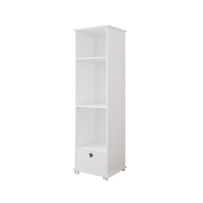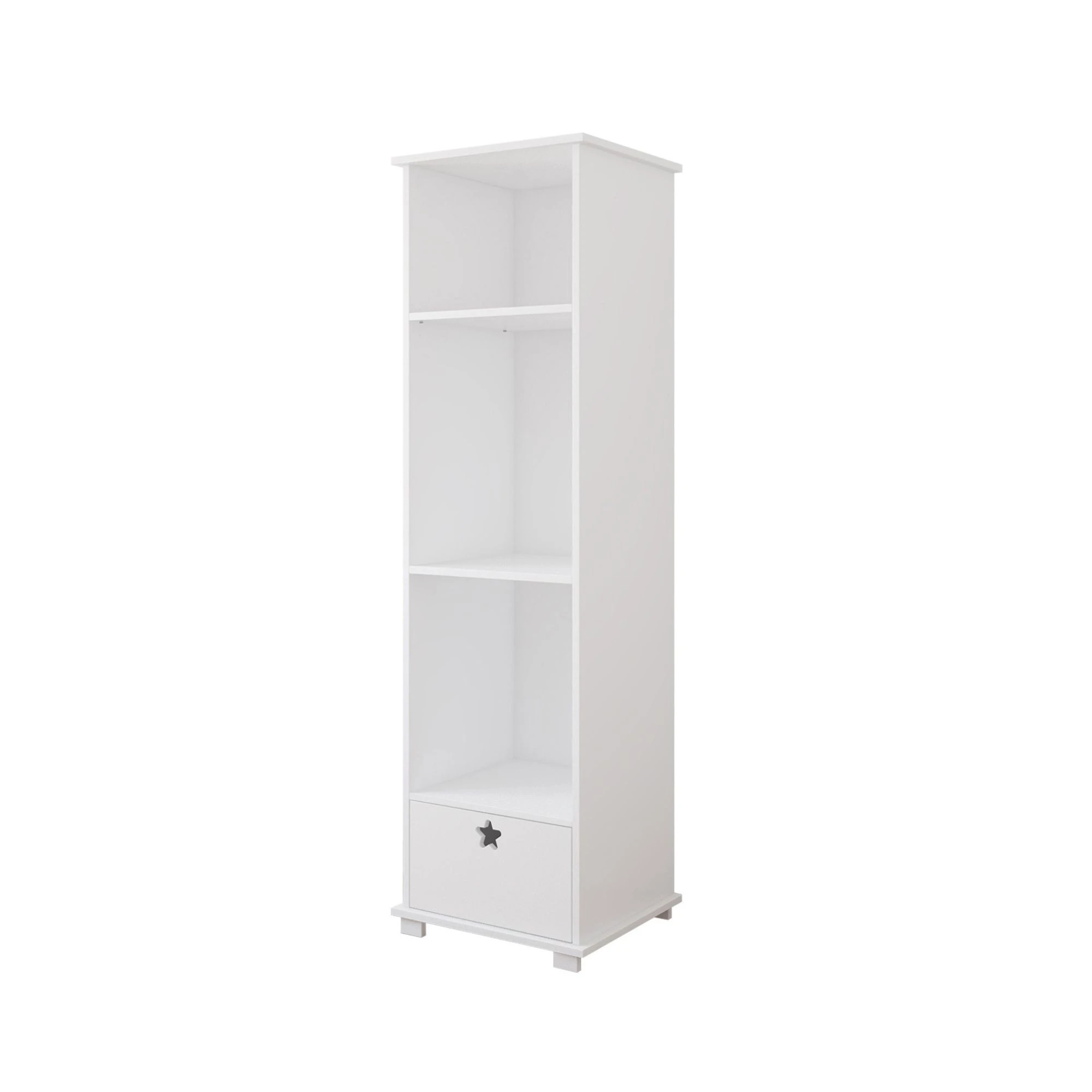 Regał dla dziewczynki Stars pomaga uporządkować książki, zabawki i dekoracje w jednym miejscu, tworząc przytulny kącik w pokoju dziecka. Prosta biała bryła, uchwyt w kształcie gwiazdki oraz kolorowe wykończenia wieńców sprawiają, że regał idealnie uzupełnia meble dla dziewczynki z kolekcji Stars – możesz zestawić go z biurkiem, szafą i łóżkiem w tej samej linii.