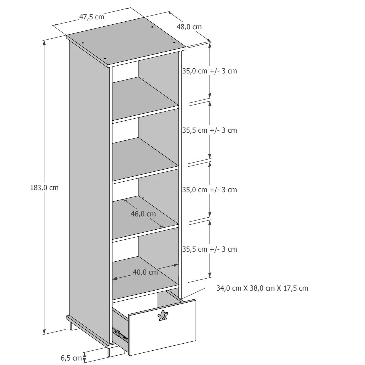 Otwarta forma regału ułatwia dziecku odkładanie ulubionych przedmiotów na miejsce. Dolna szuflada na prowadnicach rolkowych z ogranicznikiem pomieści mniejsze zabawki, gry lub akcesoria szkolne. Dzięki temu w pokoju łatwiej utrzymać porządek, a wszystko ma swoje stałe miejsce.
