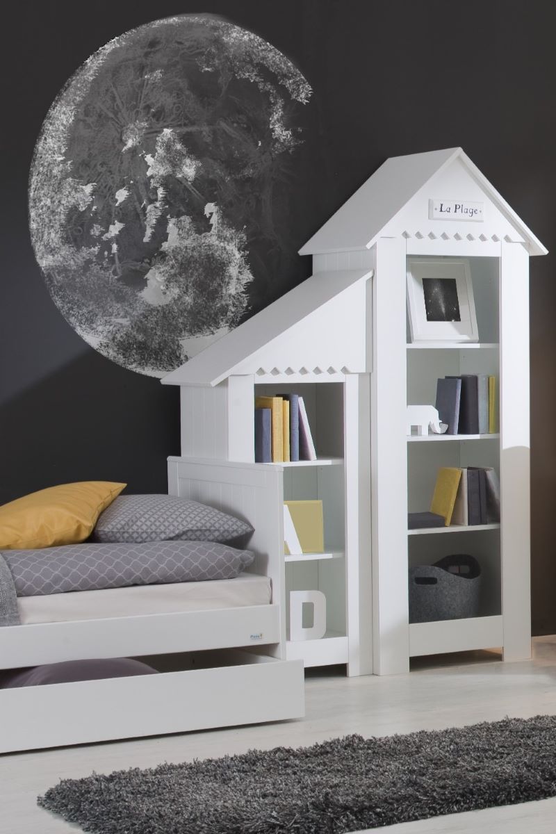 Regał mały Marsylia to lekki w formie, a jednocześnie bardzo funkcjonalny regał domek do pokoju dziecka. Charakterystyczny daszek i tabliczka „La Plage” nawiązują do francuskich domków plażowych, które są motywem przewodnim kolekcji Marsylia. Biała kolorystyka rozświetla wnętrze i pasuje zarówno do pokoju niemowlęcia, jak i pokoju przedszkolaka czy starszego dziecka.