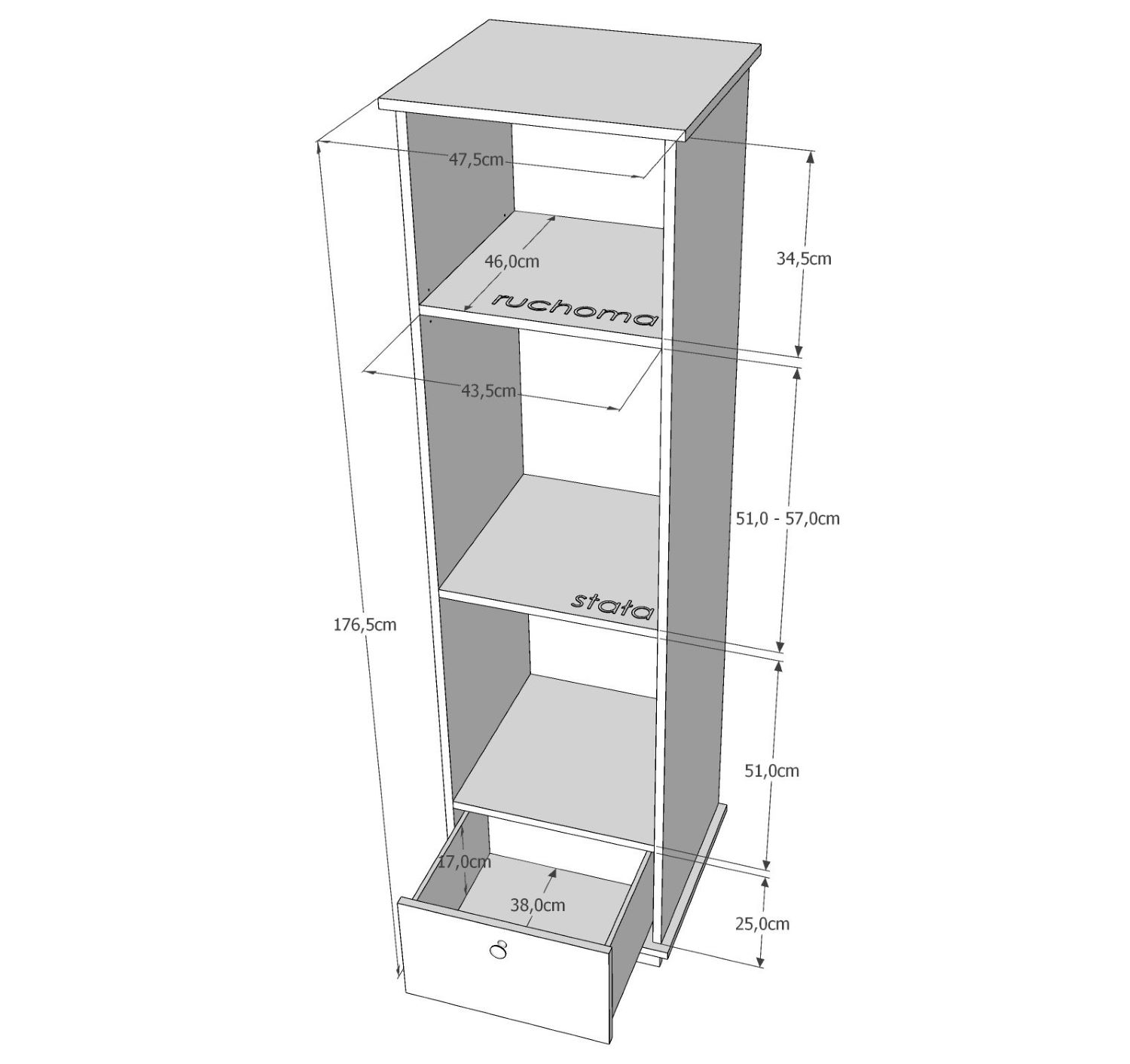 cztery otwarte półki (w tym półka ruchoma, pozwalająca dopasować wysokość do przechowywanych rzeczy)