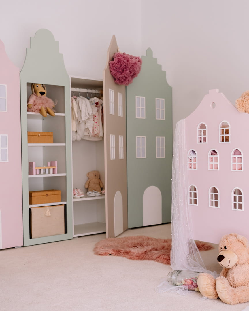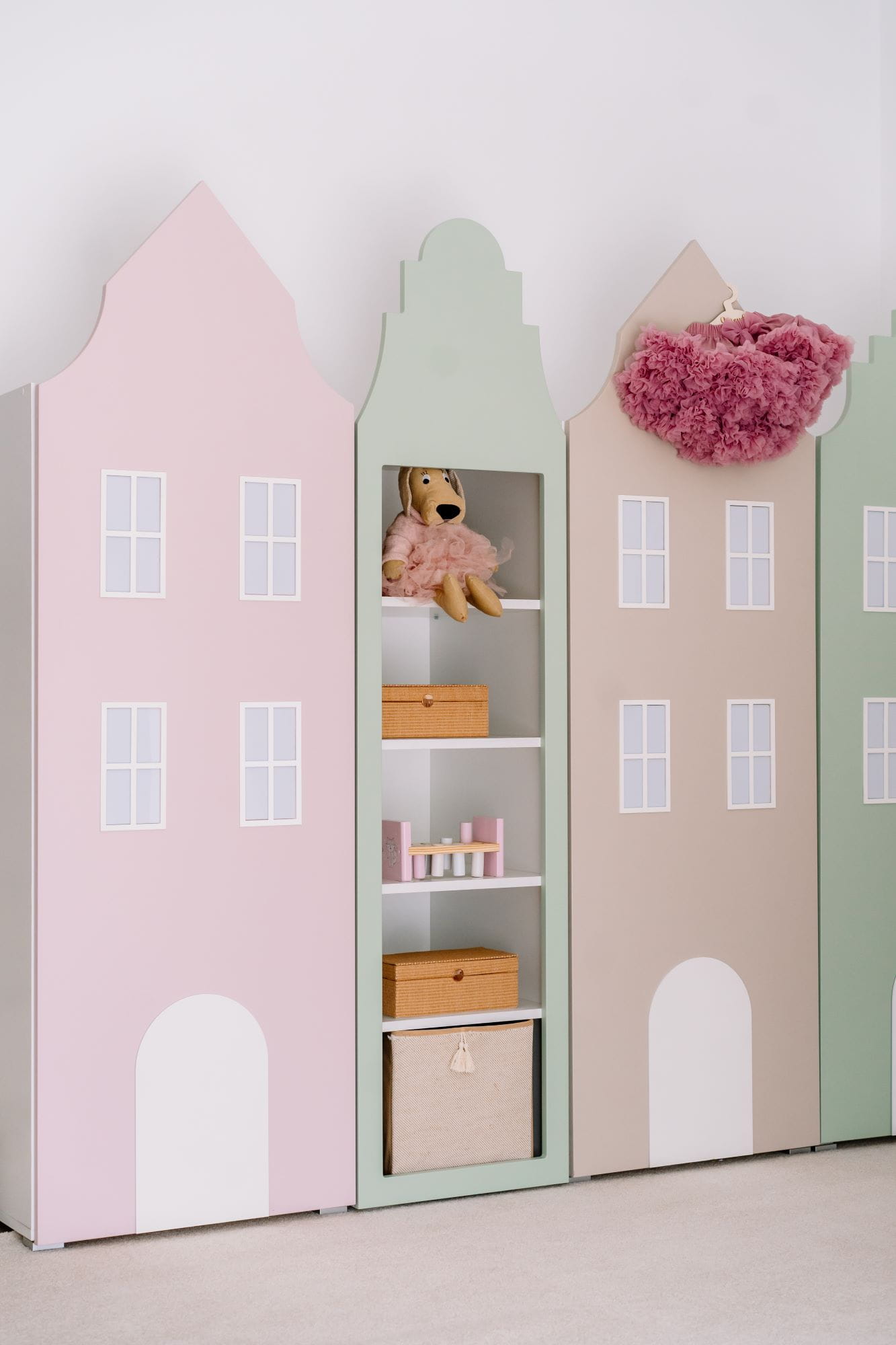 Regał kamieniczka Amsterdam dostępna jest w jednym z pięciu pastelowych kolorów: beżowym, niebieskim, różowym, szarym lub zielonym, dzięki czemu pasować będzie do każdego pokoju dziecka. Może stać jako samodzielny mebel lub tworzyć wspaniały zestaw z innymi meblami kamieniczkami: szafami, regałami i łóżeczkiem. Co więcej, każdy z mebli może być w innym kolorze stanowczo mówiąc "nie" nudzie w dziecięcym pokoju!