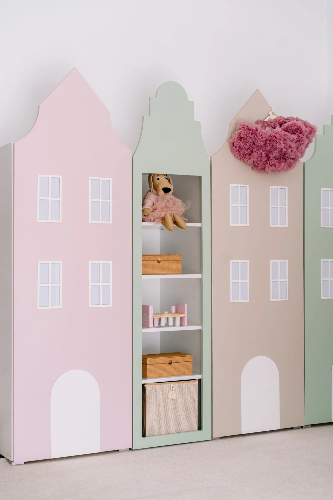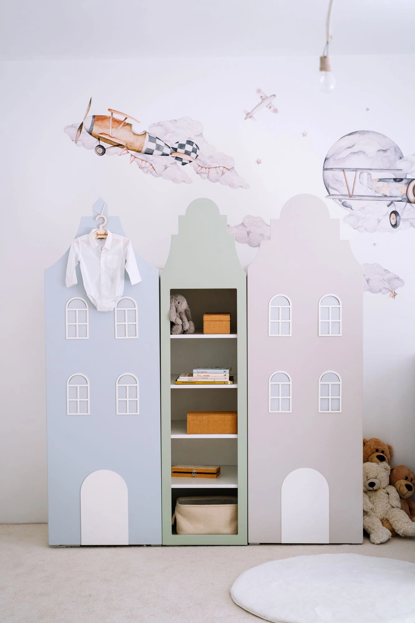 Regał kamieniczka Kraków dostępna jest w jednym z pięciu pastelowych kolorów: beżowym, niebieskim, różowym, szarym lub zielonym, dzięki czemu pasować będzie do każdego pokoju dziecka. Może stać jako samodzielny mebel lub tworzyć wspaniały zestaw z innymi meblami kamieniczkami: szafami, regałami i łóżeczkiem. Co więcej, każdy z mebli może być w innym kolorze stanowczo mówiąc "nie" nudzie w dziecięcym pokoju!