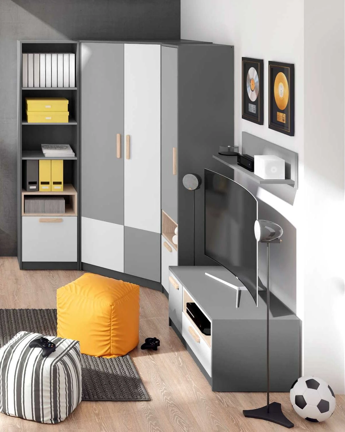Połączenie trzech kolorów – jasnej szarości, grafitu i bieli wygląda nowocześnie, a jednocześnie jest bardzo uniwersalne i zapewnia łatwą aranżację w każdym wnętrzu. Detale w kolorze drewna dodają przytulności i dobrej energii.