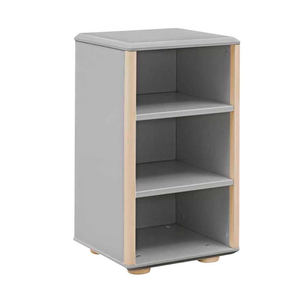 Regał niski wąski Funflex to kompaktowy regał do pokoju młodzieżowego o wymiarach 40 × 72 × 40 cm, który dzięki swojej formie świetnie wypełnia wąskie przestrzenie między meblami, a nawet miejsce pod łóżkiem podniesionym Funflex. Otwarta konstrukcja z trzema półkami idealnie dopełnia aranżacje z innymi meblami z kolekcji Funflex – szafami, komodami, regałami i łóżkiem w bieli lub szarości.