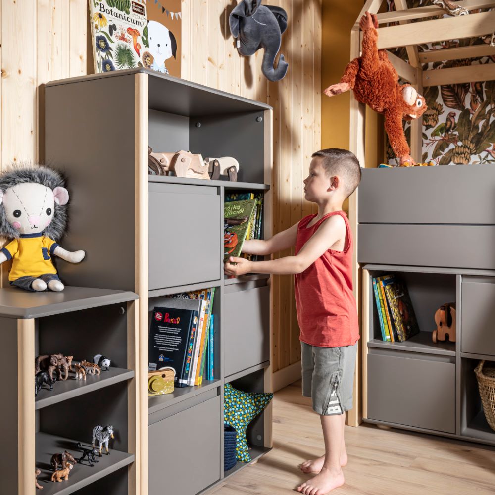Dzięki wysokości 72 cm regał niski wąski Funflex możesz wykorzystać nie tylko przy ścianie, ale także jako element zabudowy pod łóżkiem podniesionym Funflex. W ten sposób wolna przestrzeń pod strefą snu zmienia się w praktyczny mini–regalik na książki, notesy czy pudełka z akcesoriami, nie zabierając miejsca w pozostałej części pokoju.