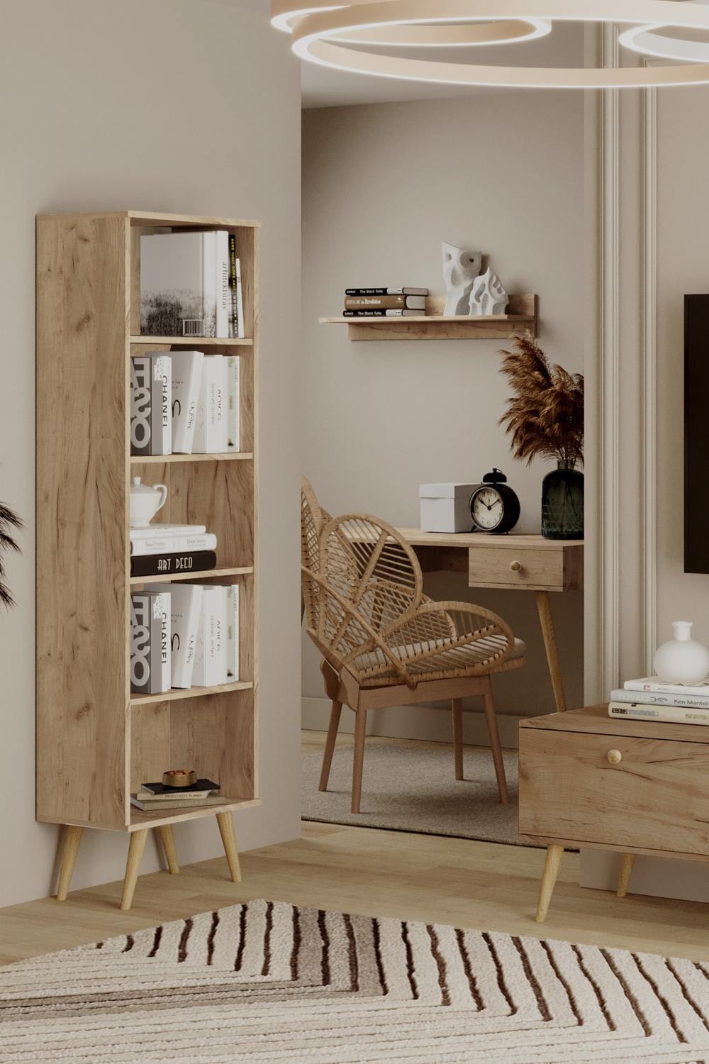 Regał półka - Millea dąb craft to stylowy i funkcjonalny element wyposażenia, idealny do pokoju dziewczynki. Jego naturalny odcień dębu craft wprowadza do wnętrza ciepło i przytulność, doskonale komponując się z innymi drewnianymi elementami i tworząc harmonijną przestrzeń. Prosta i lekka forma regału sprawia, że jest on uniwersalny i pasuje do różnych aranżacji wnętrz, zarówno tych bardziej klasycznych, jak i nowoczesnych.