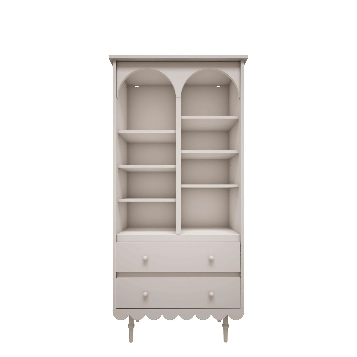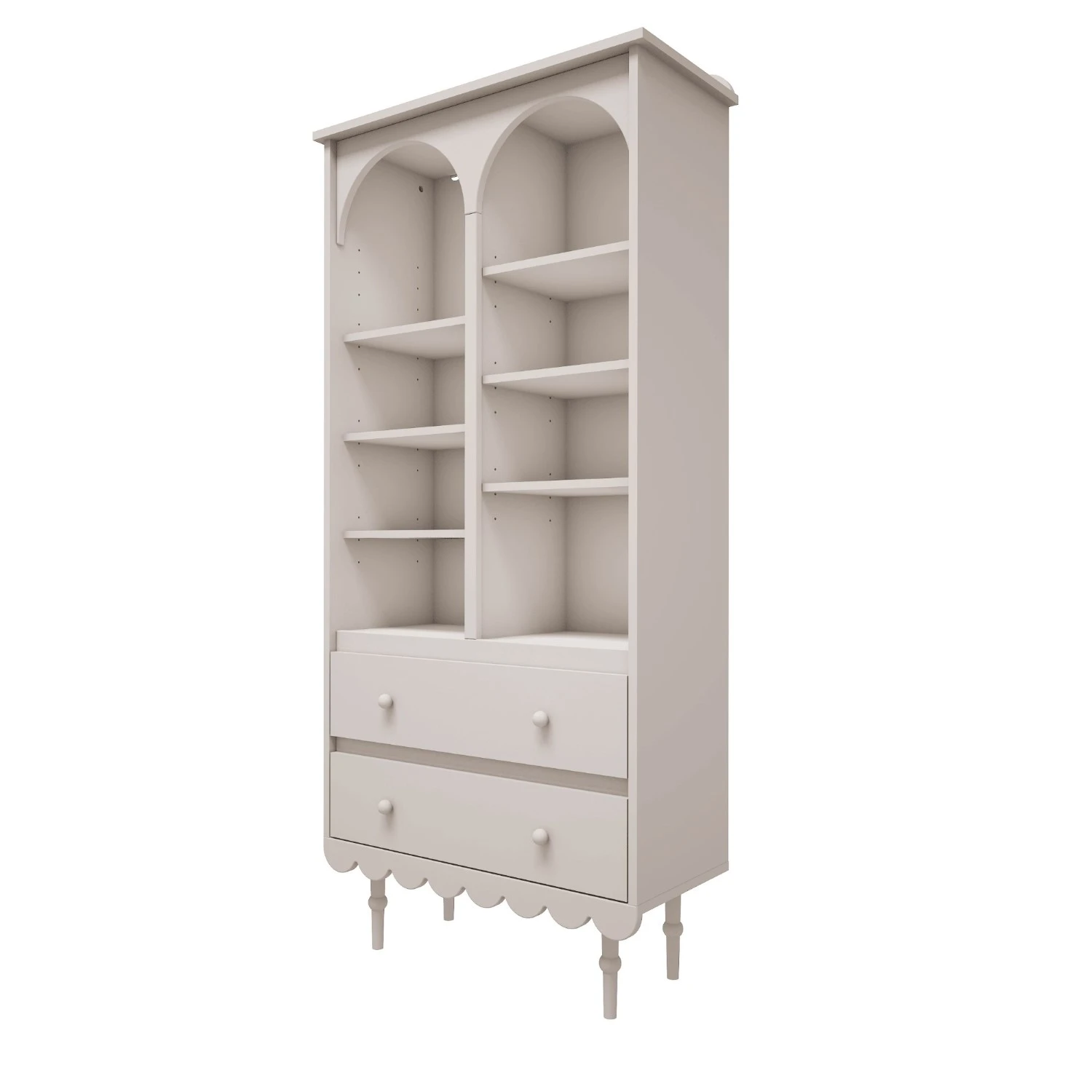 Regał wysoki Babushka biały to wysmukły regał do pokoju dziewczynki w ciepłym odcieniu bieli RAL 9010. Łagodne łuki, frezowane wykończenie dolnej krawędzi i toczone nóżki z drewna bukowego nadają mu subtelny, retro charakter. W zestawie z pozostałymi meblami dla dziewczynek z kolekcji Babushka pozwala stworzyć spójny, lekki wizualnie pokój.