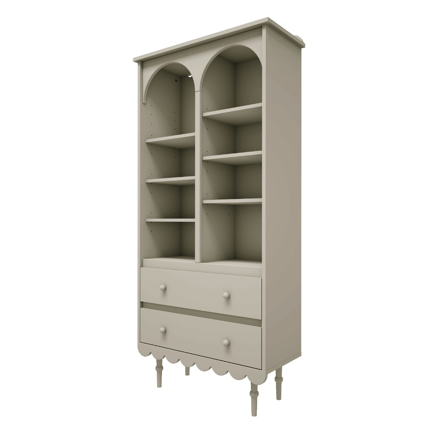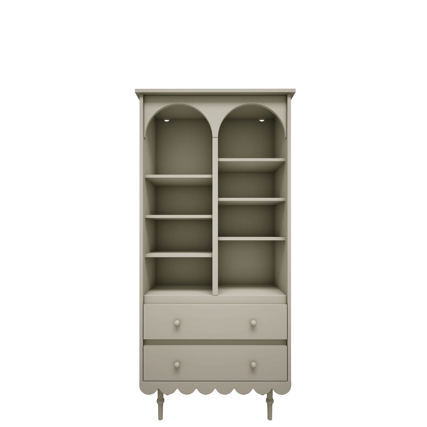 Regał wysoki Babushka oliwka to pojemny regał dla dziewczynki w stonowanym kolorze oliwka RAL 7032. Wysoka bryła, łagodne łuki we wnękach i dekoracyjne wykończenie u dołu nawiązują do stylu retro, a smukłe, bukowe nóżki sprawiają, że mebel wygląda lekko. W połączeniu z innymi meblami dla dziewczynek z kolekcji Babushka stworzysz spójny, przytulny pokój na lata.