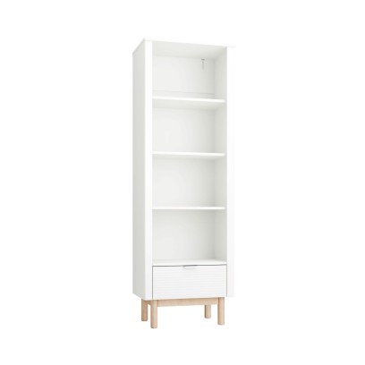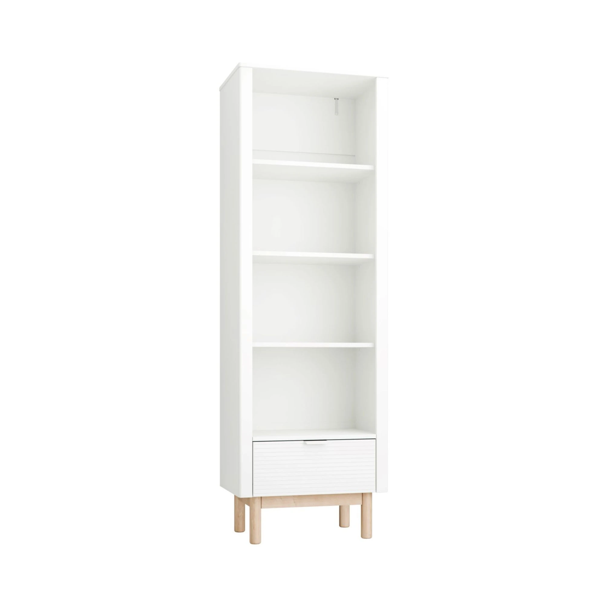 Biały regał wysoki Miloo to mebel, który porządkuje pokój dziecka i nastolatka – od pierwszych pluszaków, przez książki szkolne, aż po dekoracje i pamiątki. Prosta bryła w kolorze czystej bieli, ryflowany front szuflady, subtelne metalowe uchwyty oraz bukowe nóżki sprawiają, że regał wygląda lekko i nowocześnie. Świetnie dopełnia inne meble z kolekcji Miloo – komodę, szafę, łóżko czy biurko – dzięki czemu możesz stworzyć spójną aranżację całego pokoju w jednym stylu.