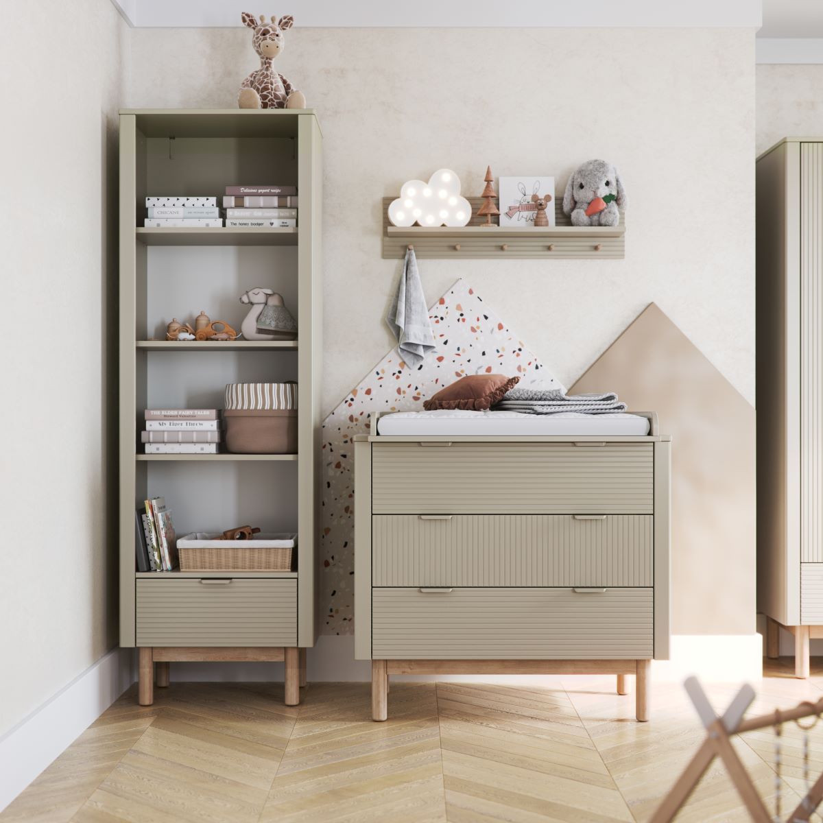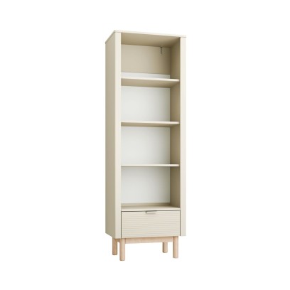 Szampański regał wysoki Miloo to smukły, elegancki mebel do pokoju dziecka i nastolatka, który pomaga utrzymać porządek w strefie zabawy i nauki. Ciepły kolor frontu, ryflowane wykończenie szuflady oraz bukowe nóżki sprawiają, że regał pasuje zarówno do przytulnego pokoju niemowlęcia, jak i spokojniejszego, młodzieżowego wnętrza. W duecie z innymi meblami z kolekcji Miloo – komodą, szafą, łóżkiem czy biurkiem – tworzy spójny zestaw na lata.