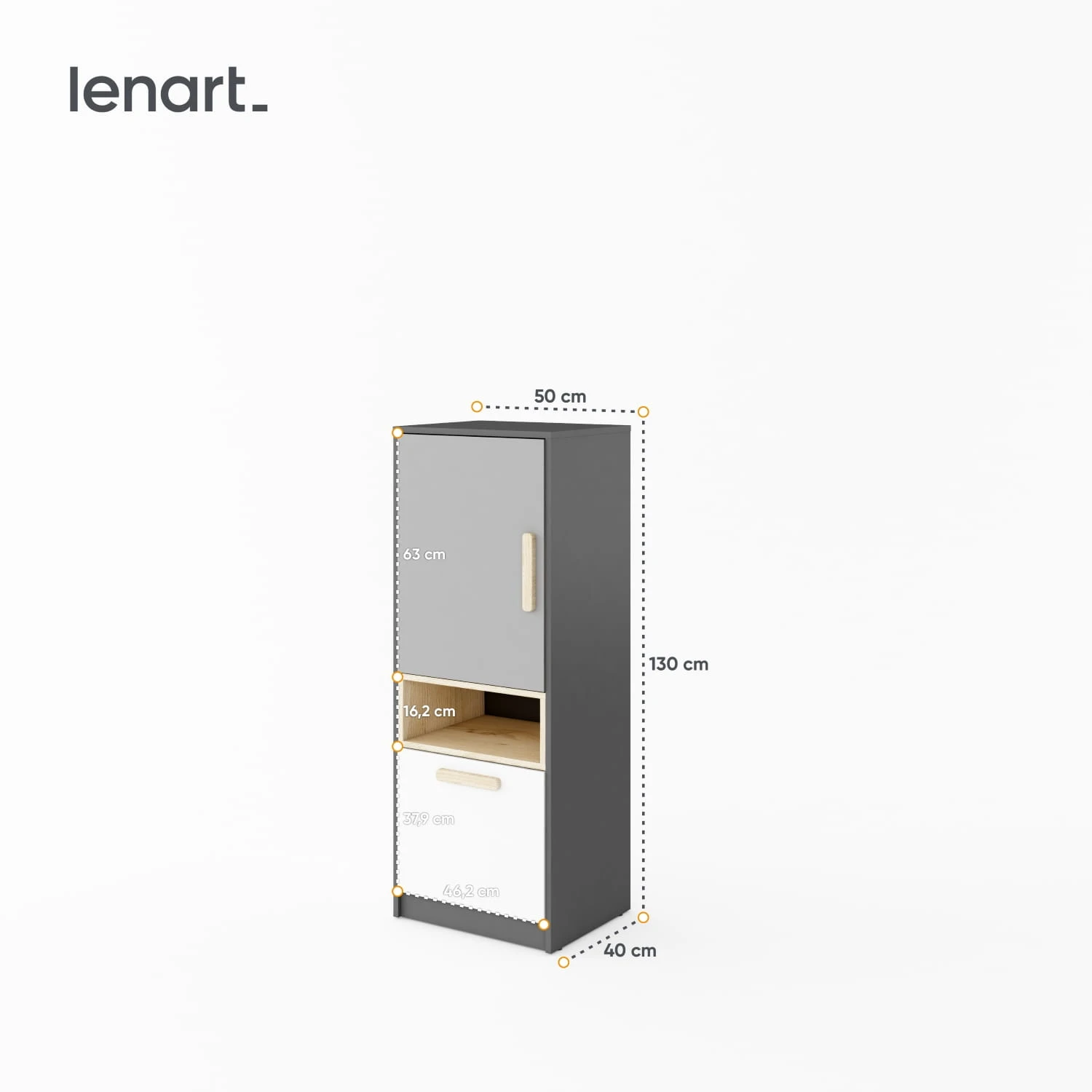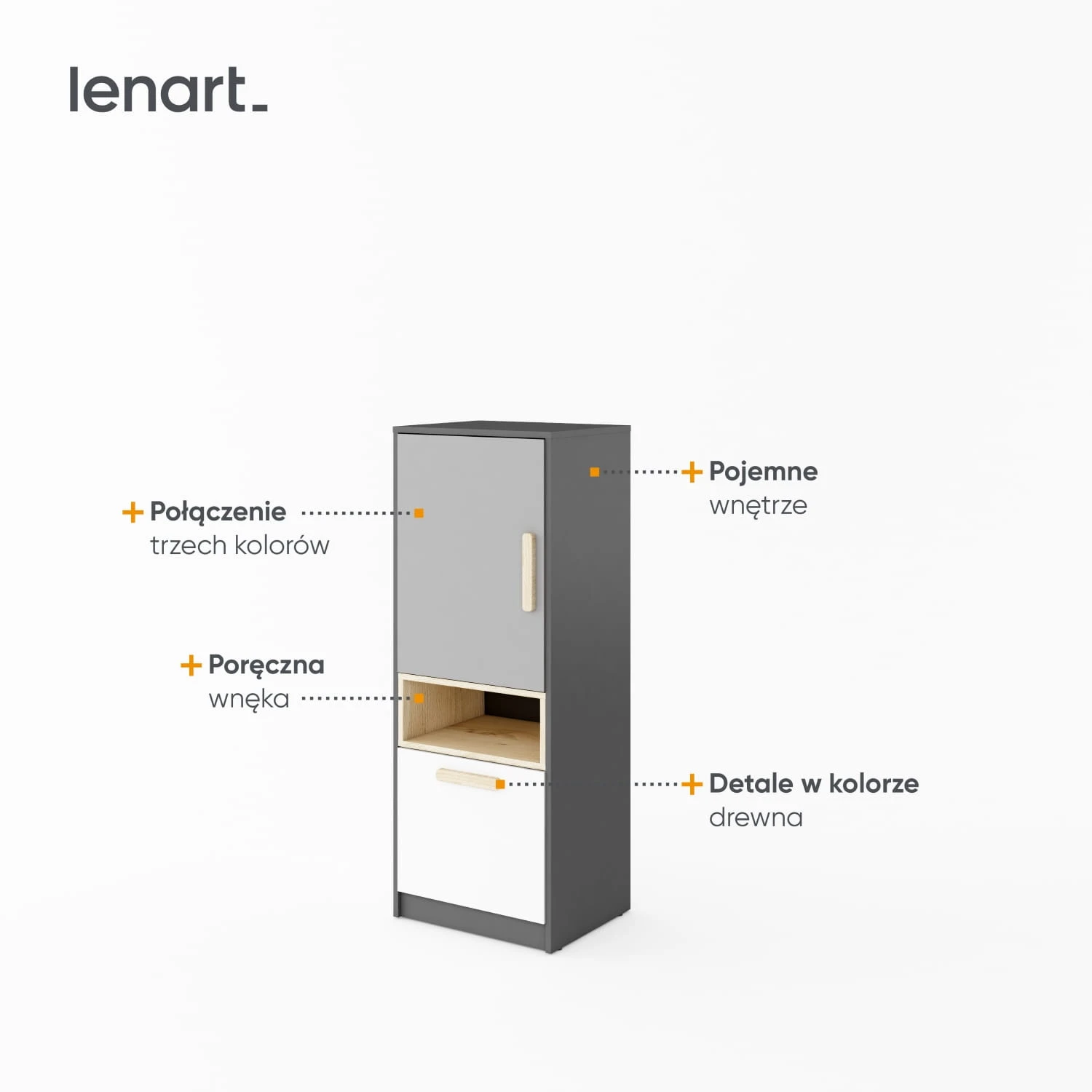 Mały regał z drzwiami, za którymi kryją się pojemne półki do przechowywania. W środkowej części zaplanowano głęboką półkę na szkolne akcesoria i inne drobiazgi.