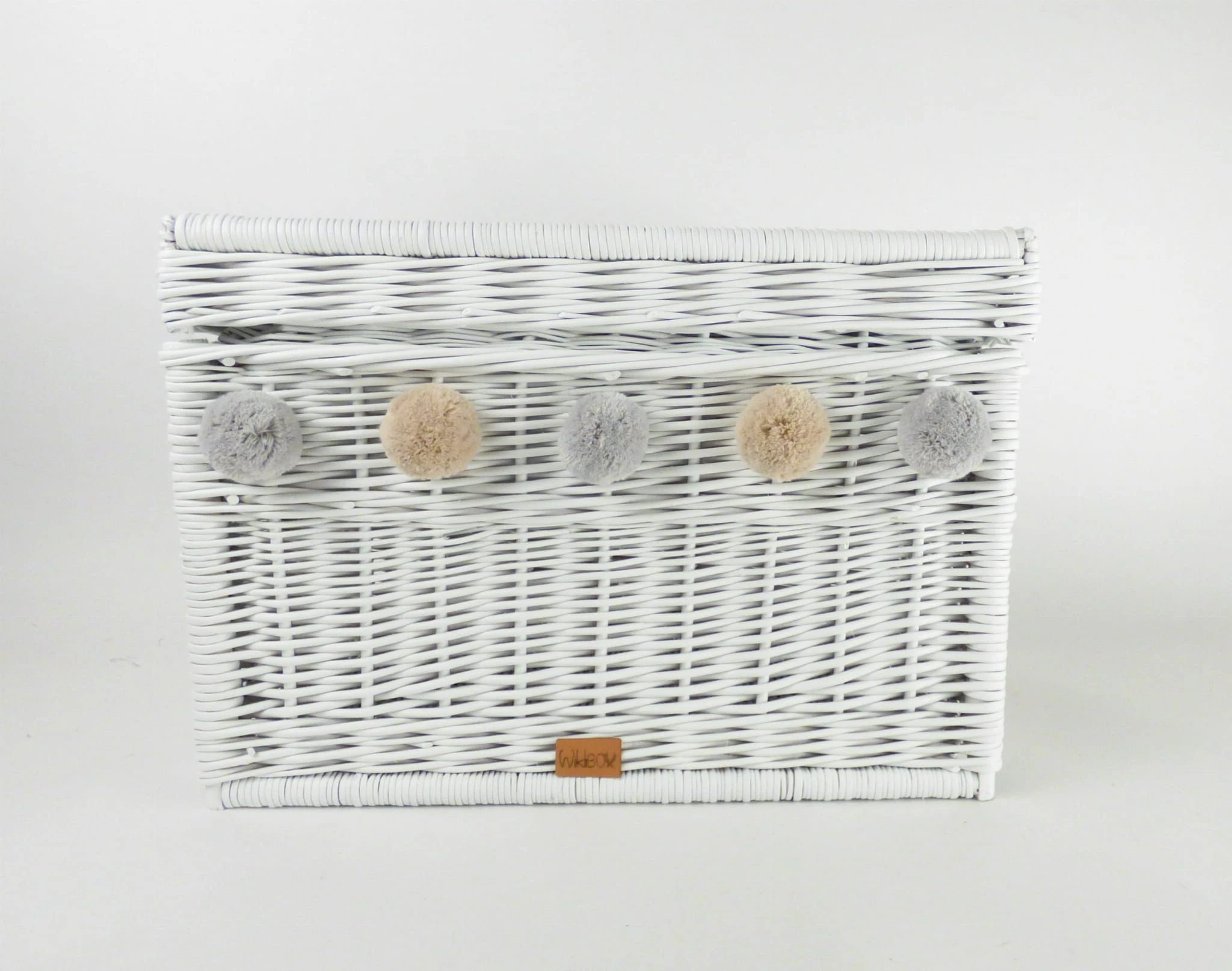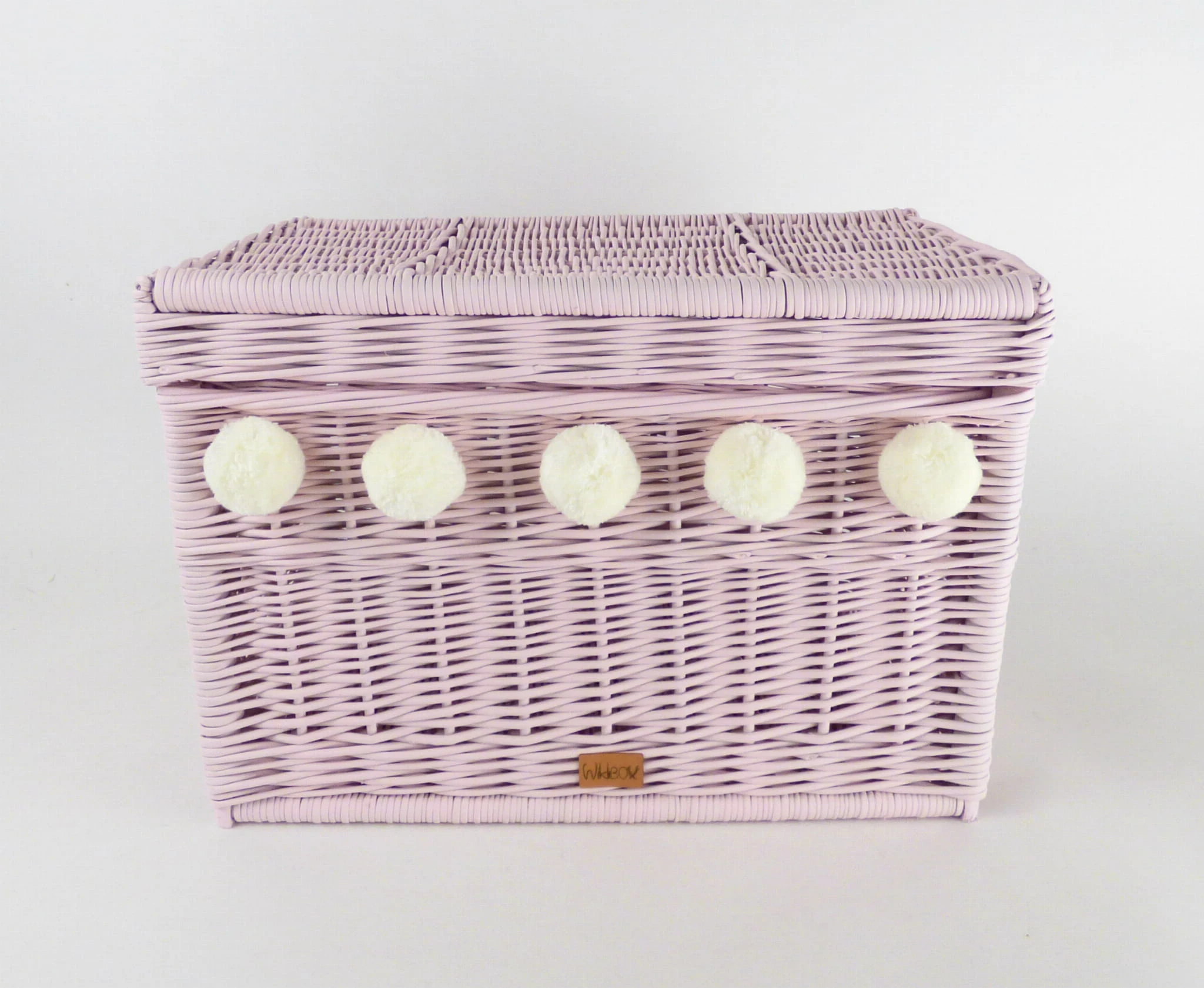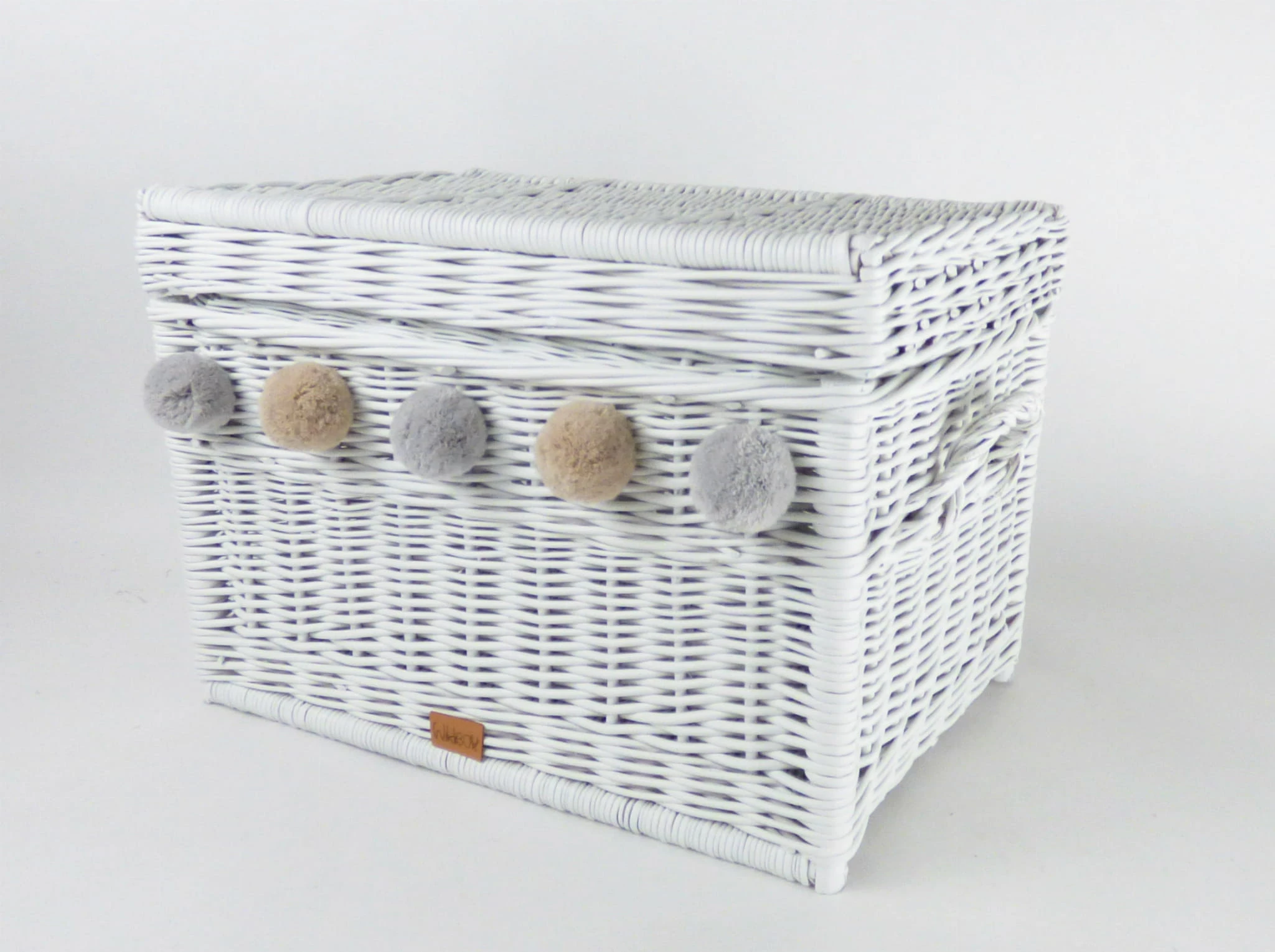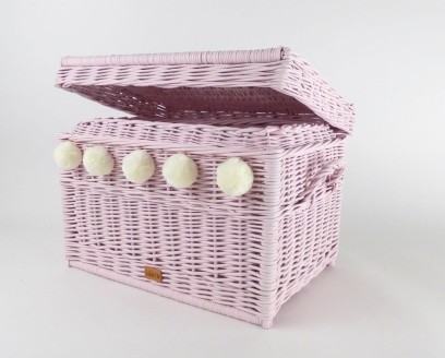 Skrzynia wiklinowa na zabawki udekorowana pięcioma mięciutkimi pomponami. Idealny dodatek do pokoju dziewczynki i wszystkich dzieci, które uwielbiają kolorowe pomponiki. Skrzynia na zabawki, która pomieści wszystkie dziecięce skarby, a gdy jest zamknięta może służyć również za siedzisko. Ręcznie wyplatana wiklinowa skrzynia posiada z boku wytrzymałe uchwyty ułatwiające jej przenoszenie.