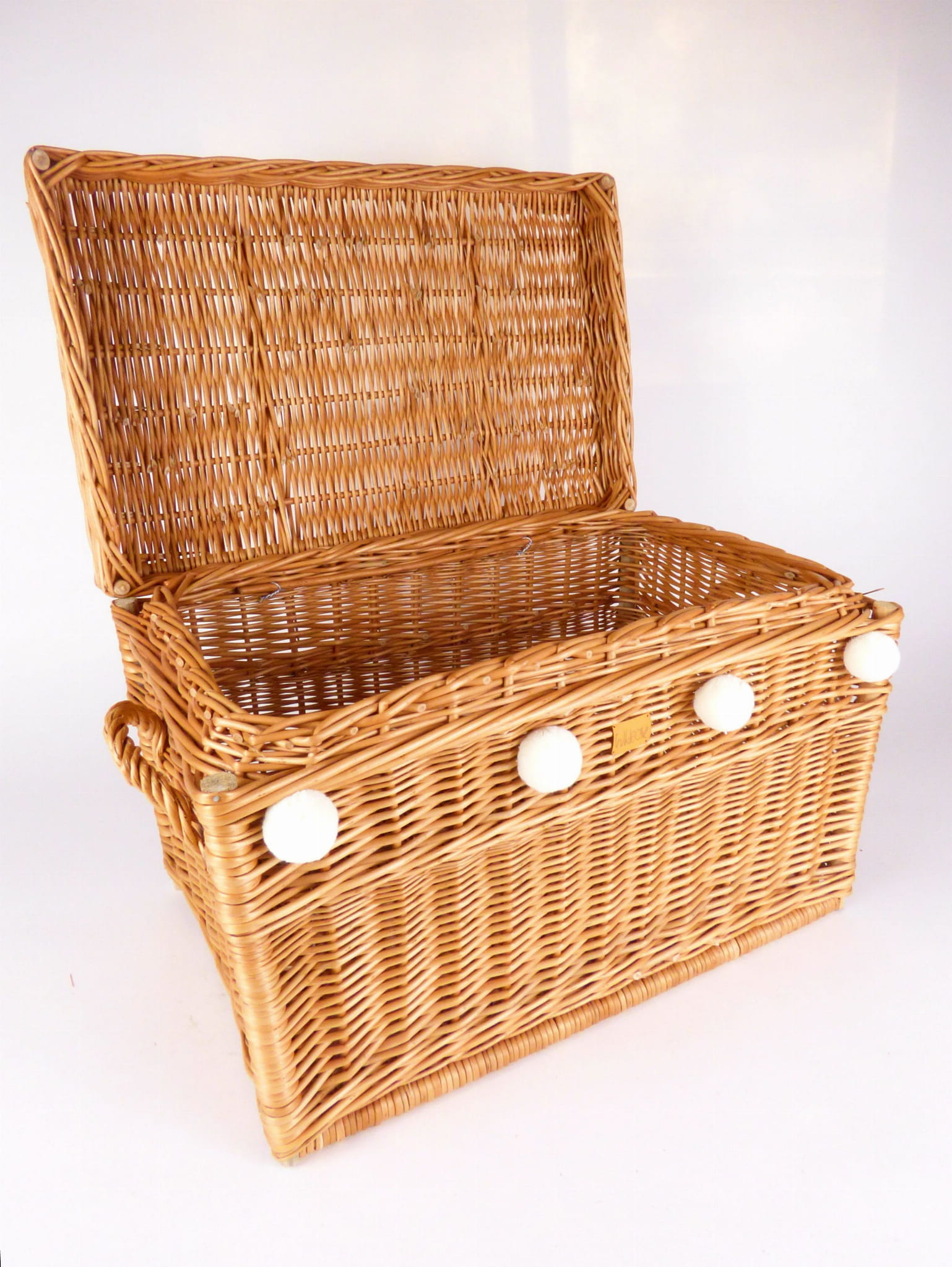Skrzynia na zabawki dostępna jest w naturalnym kolorze wikliny, co pozwala dopasować ją do każdego dziecięcego pokoju, nadając mu przy tym wyjątkowego wystroju. Skrzynia standardowo wyposażona jest w pięć pomponów, które mogą być w jednym z dostępnych kolorów lub ich mieszaniną. Prosimy wówczas w uwagach napisać, które 5 kolorów z podanych ma ozdabiać skrzynię Waszego dziecka:)