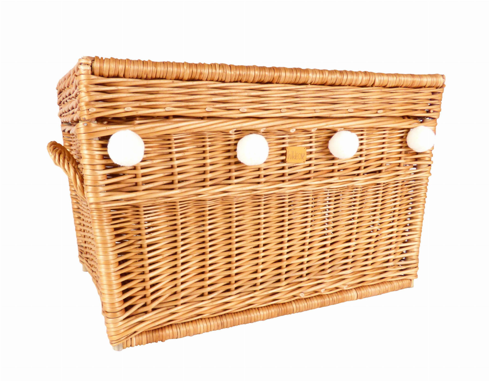 Skrzynia wiklinowa na zabawki udekorowana pięcioma mięciutkimi pomponami. Idealny dodatek do pokoju dziewczynki i wszystkich dzieci, które uwielbiają kolorowe pomponiki. Skrzynia na zabawki, która pomieści wszystkie dziecięce skarby, a gdy jest zamknięta może służyć również za siedzisko. Ręcznie wyplatana wiklinowa skrzynia posiada z boku wytrzymałe uchwyty ułatwiające jej przenoszenie.
