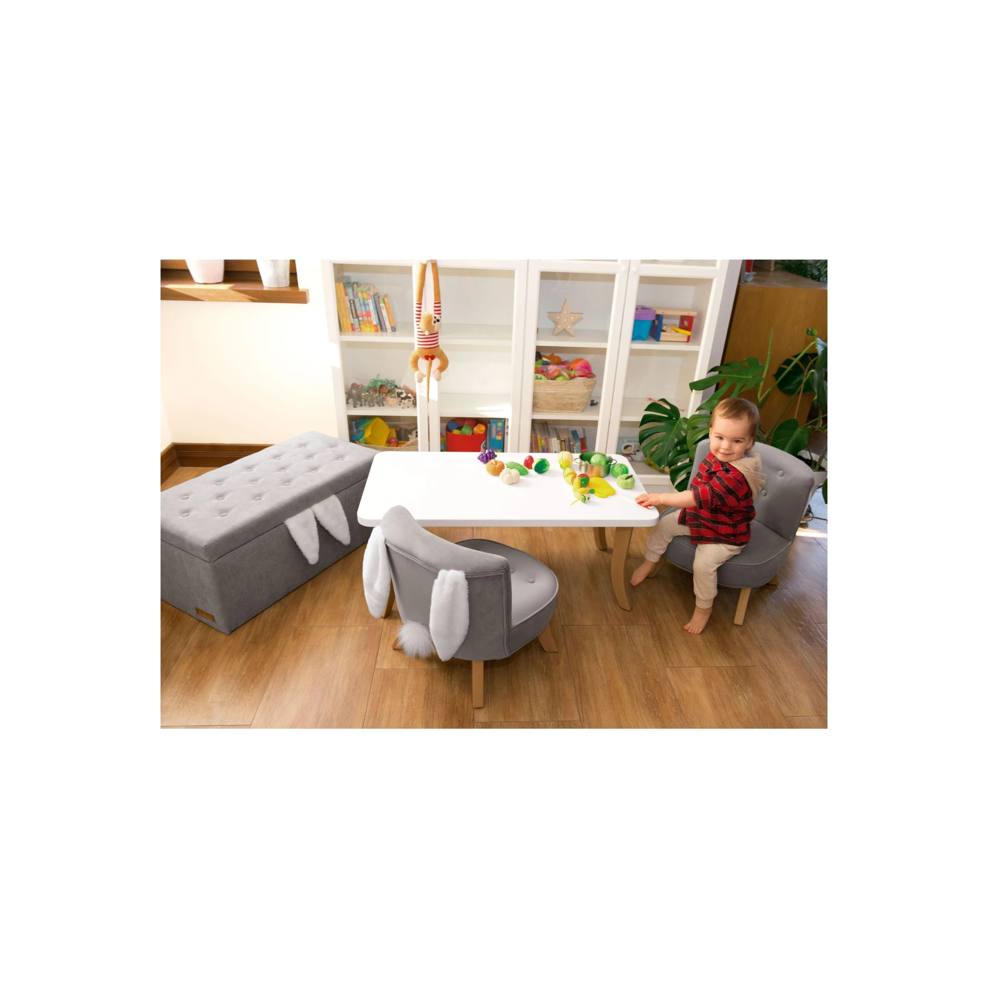 Jeśli chcesz urządzić funkcjonalny kącik, ten model będzie bardzo dobrym wyborem do zestawu z małą sofą dziecięcą lub fotelikami dla dziecka. Dzięki temu wnętrze zyskuje wyraźnie wydzieloną, przyjazną strefę do działania i odpoczynku.
