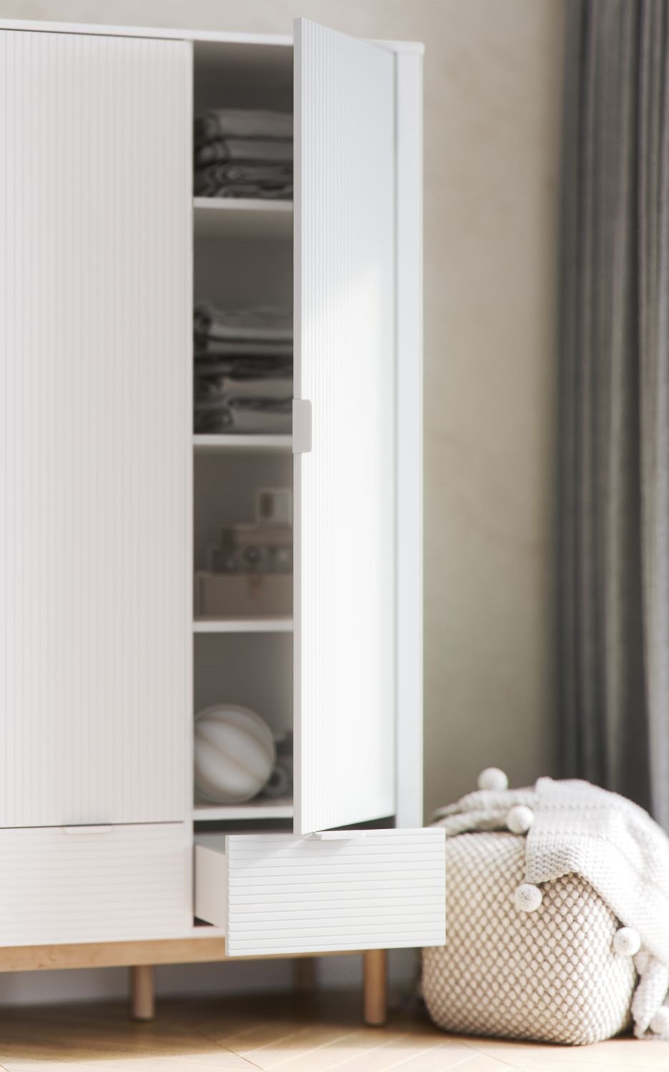 Ryflowane drzwi, dyskretne metalowe uchwyty i drewniane bukowe nóżki sprawiają, że szafa wygląda elegancko i przyjaźnie dla dziecka – to spokojne tło dla zmieniających się dodatków i tekstyliów.