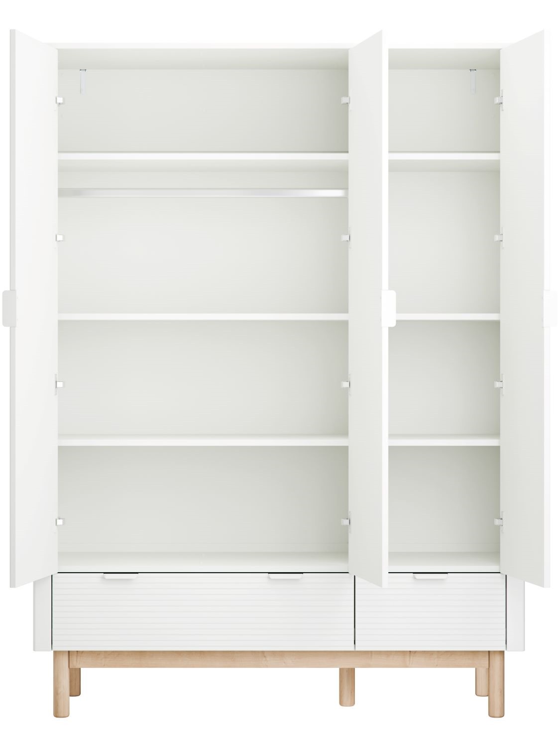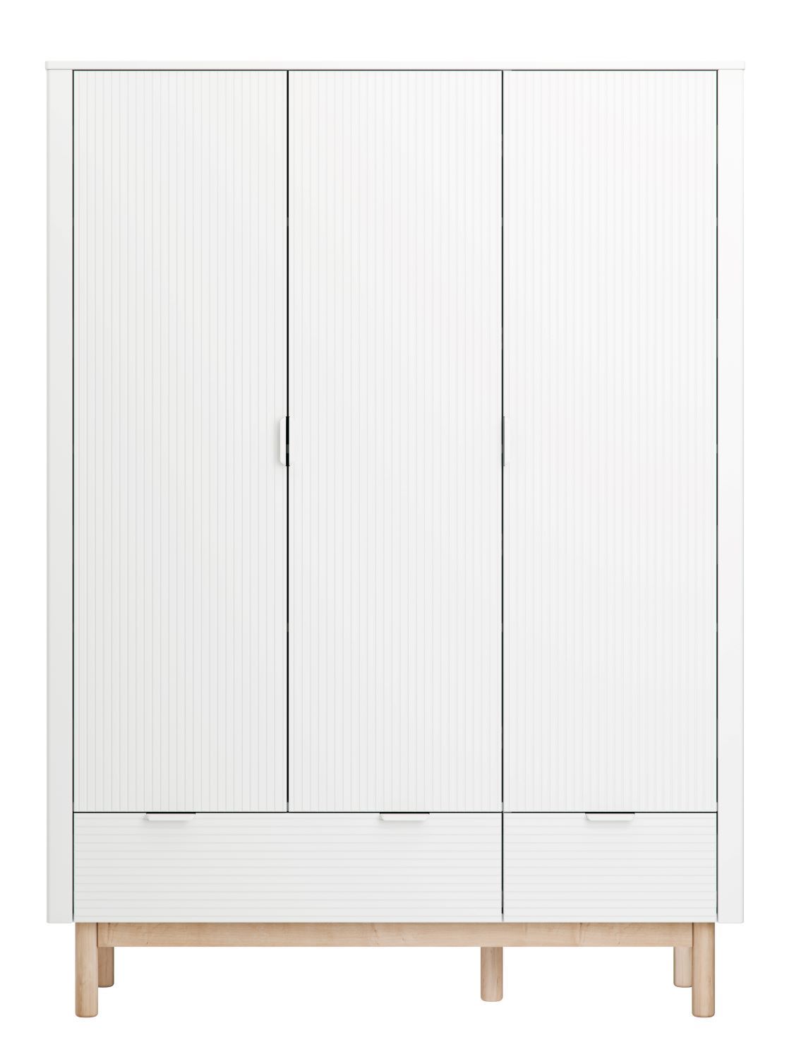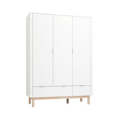 Szafa 3-drzwiowa Miloo biała to duży, funkcjonalny mebel, który pomaga uporządkować garderobę dziecka od pierwszych miesięcy aż po lata szkolne. Ryflowane fronty, czysta biel i bukowe nóżki tworzą lekką wizualnie bryłę, a spójny design pasuje do komód, regałów, łóżek i biurek z kolekcji Miloo. To szafa, która dobrze odnajdzie się zarówno w spokojnym pokoju niemowlęcia, jak i w zorganizowanej przestrzeni nastolatka.