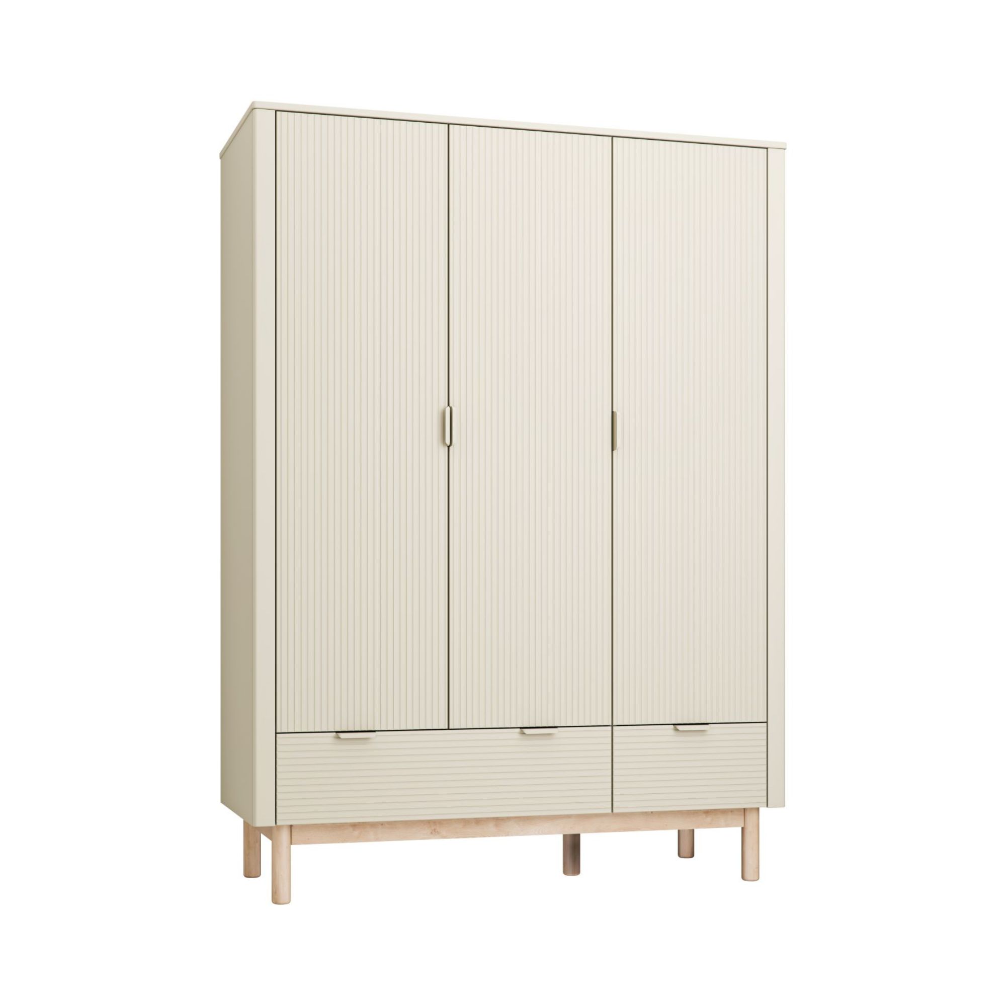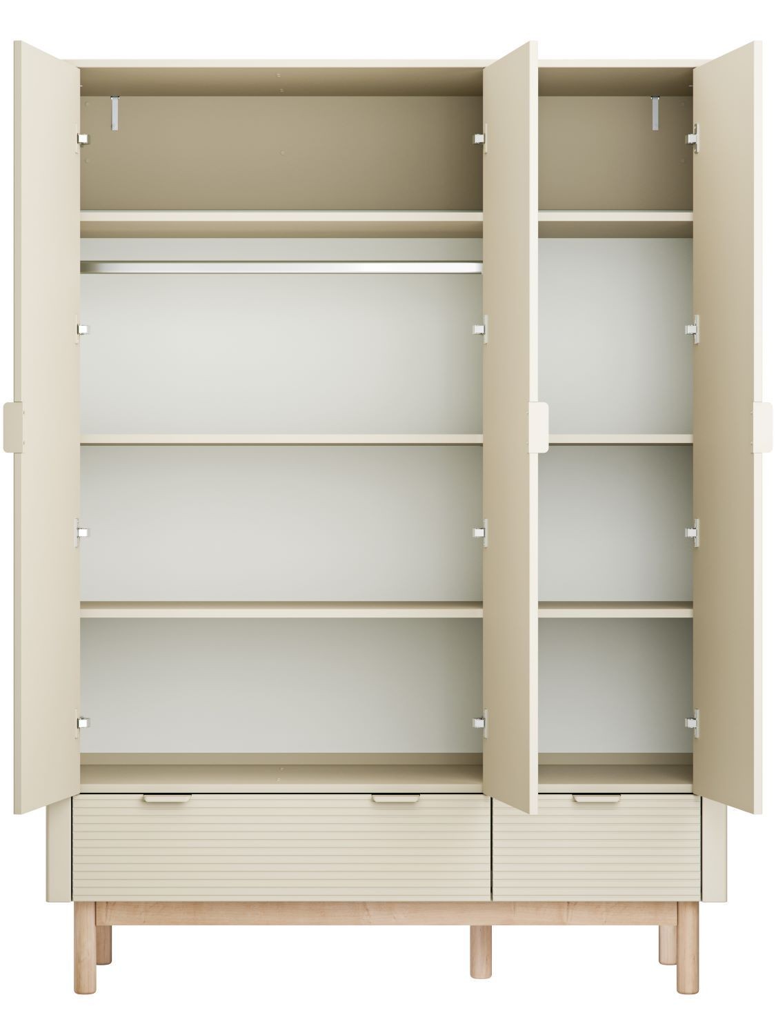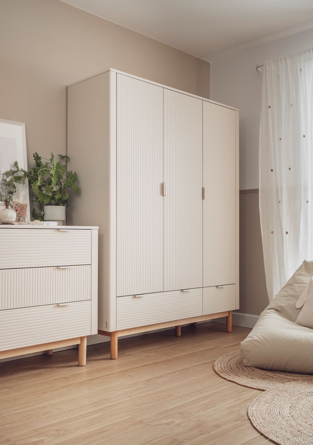 Szampańska szafa 3-drzwiowa Miloo to duży, ale wizualnie lekki mebel, który pomaga ogarnąć ubrania, tekstylia i dodatki w jednym, spójnym miejscu. Delikatny, beżowo-szampański kolor, ryflowane fronty oraz bukowe nóżki sprawiają, że szafa pasuje zarówno do przytulnego pokoju malucha, jak i stonowanego wnętrza nastolatka. W zestawie z komodą, łóżkiem, regałami i biurkiem Miloo tworzy bazę wystarczającą na wiele lat.