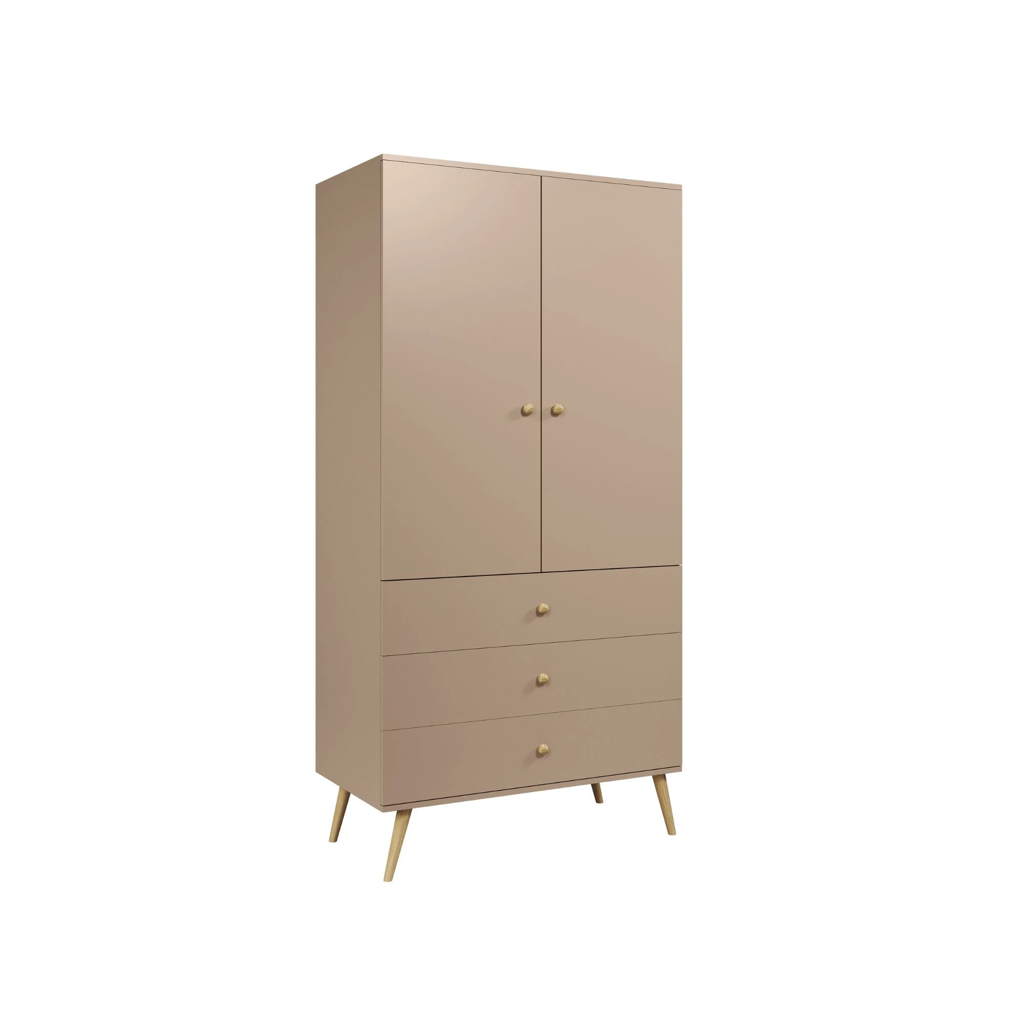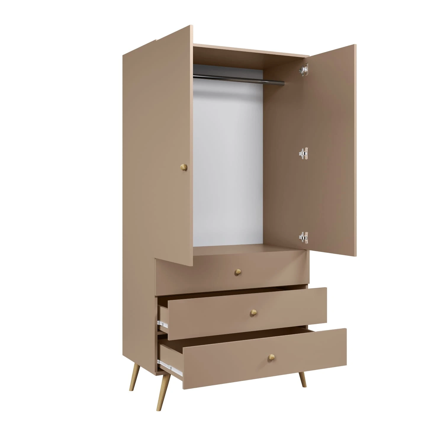 Kolor macchiato wprowadza do wnętrza ciepłą, kawową tonację, która tworzy przytulną i stylową atmosferę. Szafa Millea stoi na smukłych, drewnianych nogach, które dodają jej lekkości i elegancji, a system cichego domykania w szufladach i drzwiach zapewnia wygodę i komfort użytkowania, eliminując hałas przy zamykaniu.