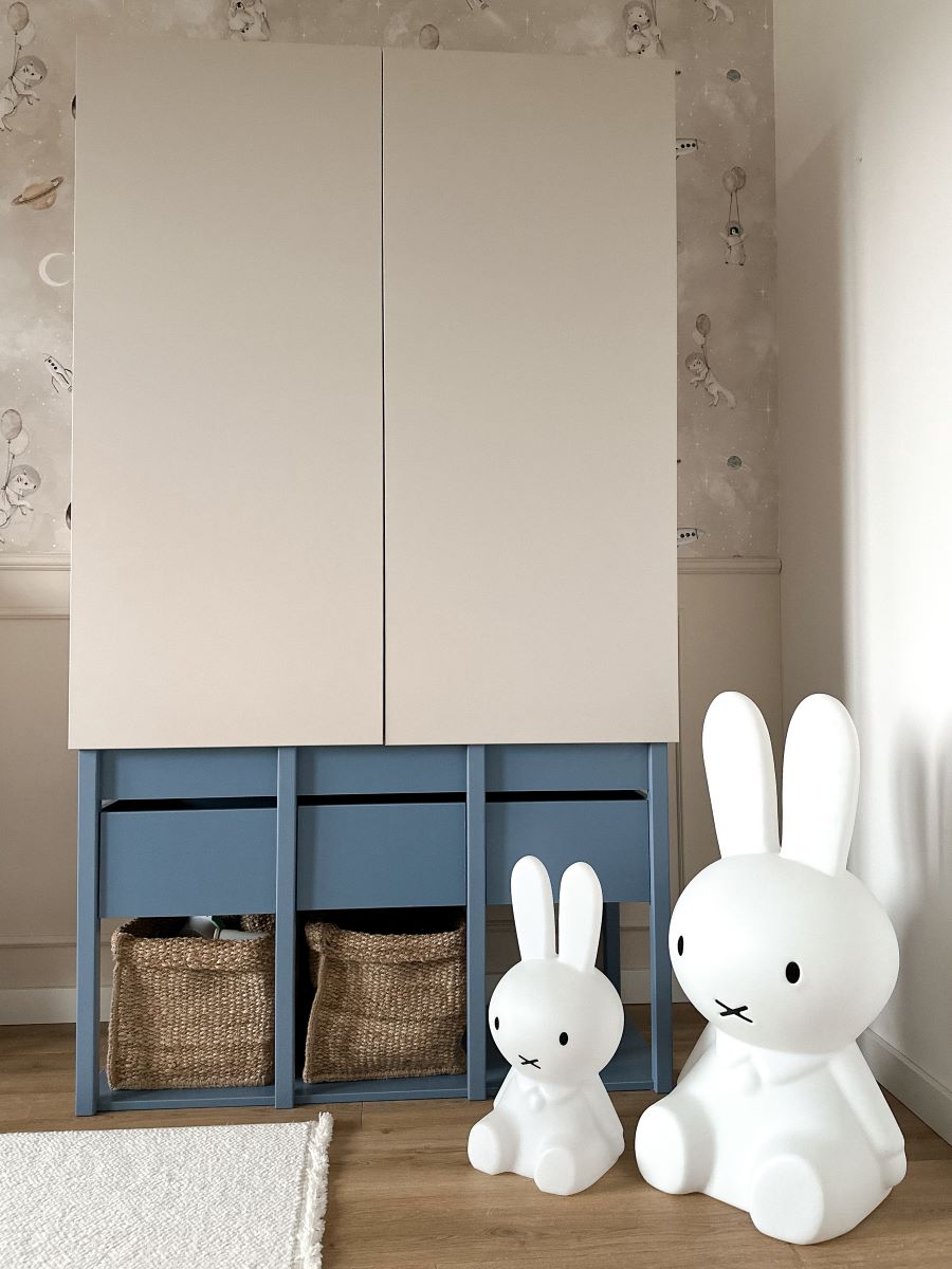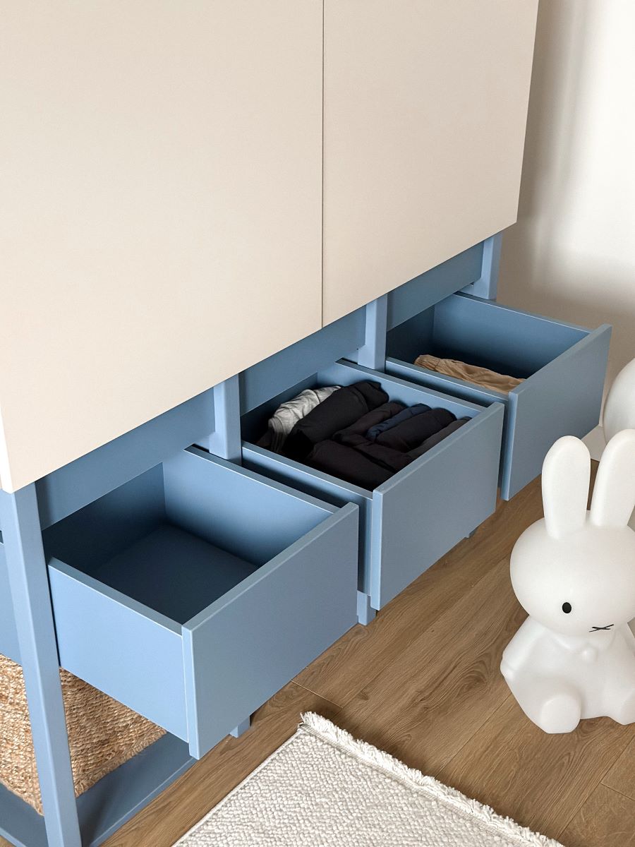 dolna otwarta przestrzeń pozwala wstawić kosze lub pojemniki na buty, zabawki czy większe tekstylia.