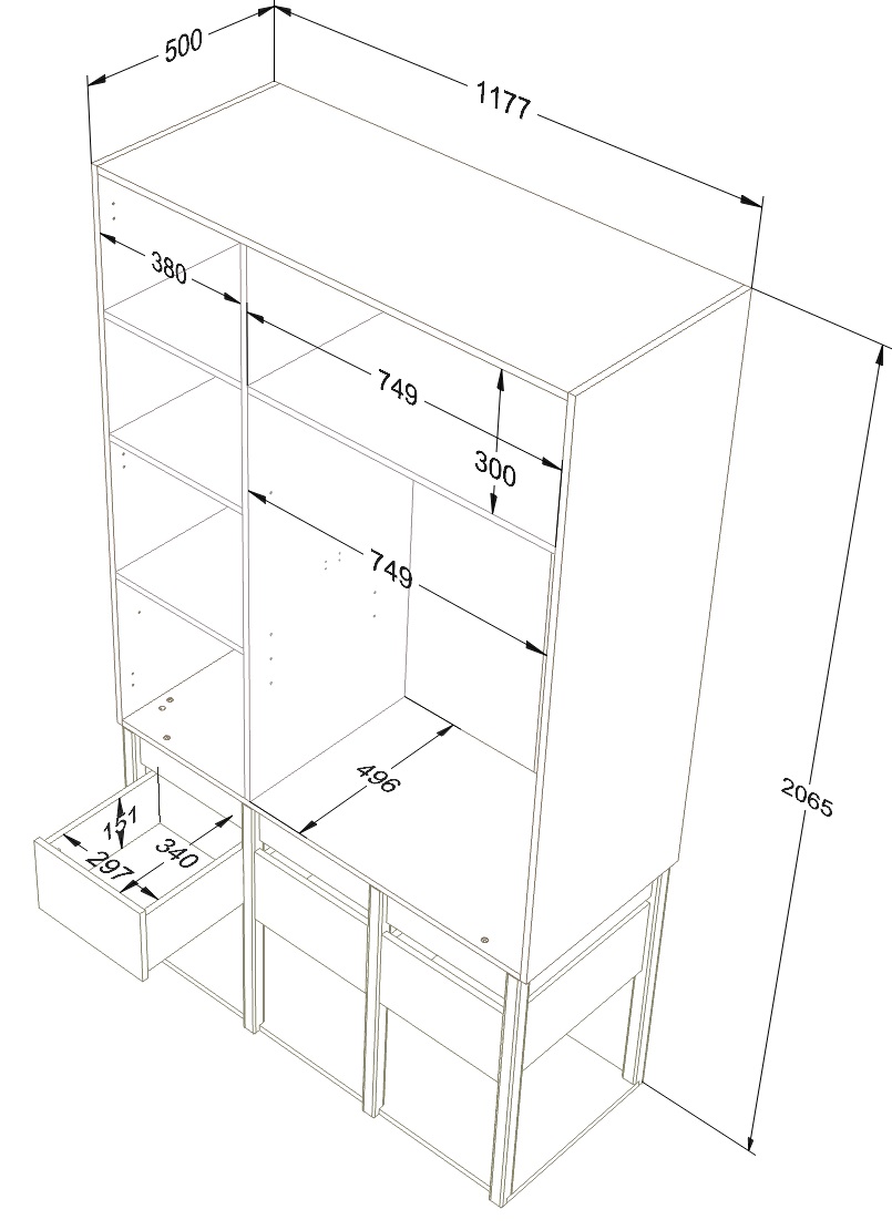 Funkcjonalność: drążek na ubrania wiszące, półki, 3 szuflady w dolnej części, otwarta przestrzeń na kosze i pojemniki
