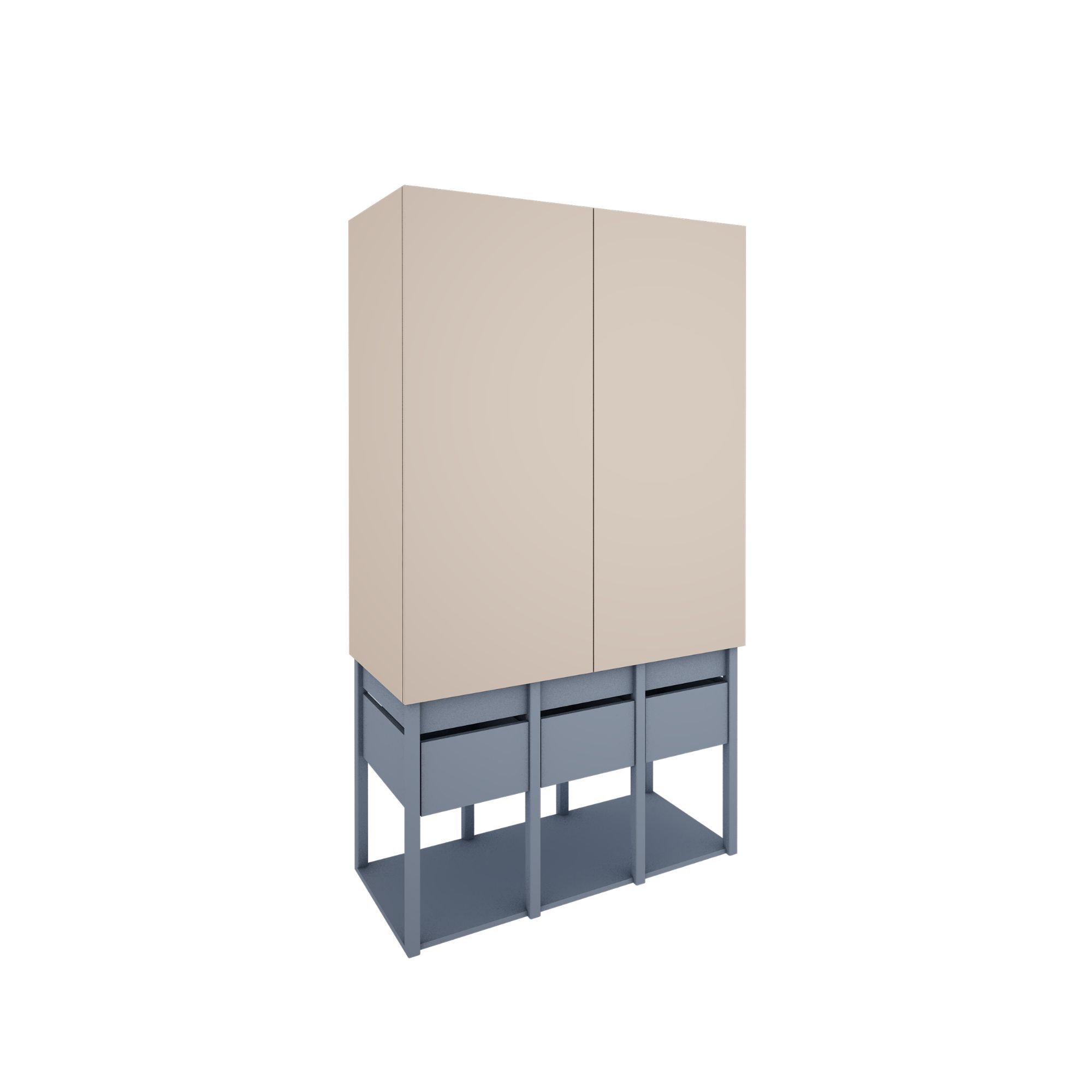 Kolorystyka: konstrukcja w odcieniu zgaszonego niebieskiego, fronty w kolorze piaskowego beżu