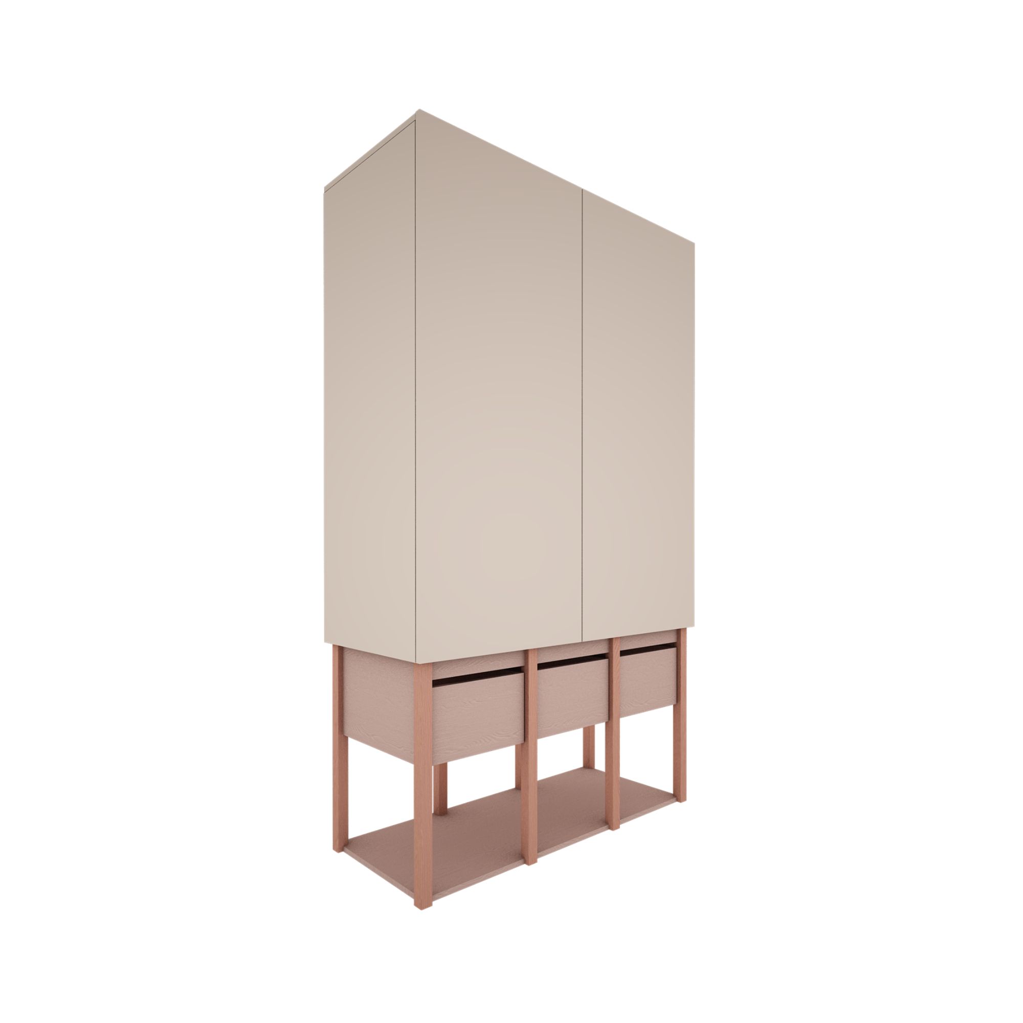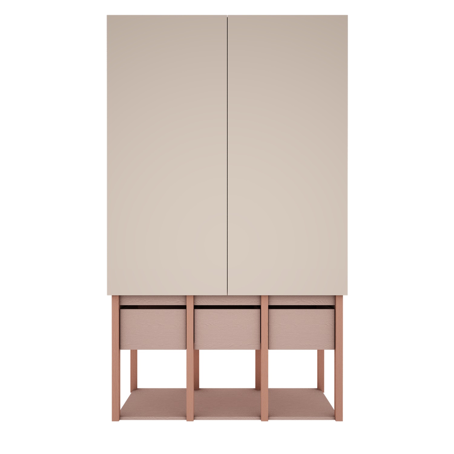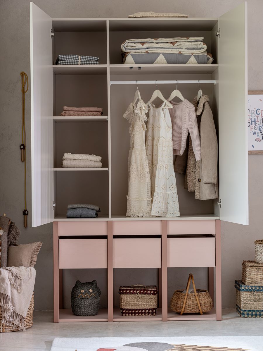 Kolorystyka szafy łączy różową konstrukcję, koralowe detale i fronty w odcieniu piaskowego beżu. Róż dodaje wnętrzu ciepła i delikatności, koral je ożywia, a beż wprowadza elegancję i równowagę. Dzięki temu szafa staje się dekoracyjnym akcentem w pokoju dziewczynki, pasującym zarówno do pastelowych, jak i bardziej stonowanych dodatków.