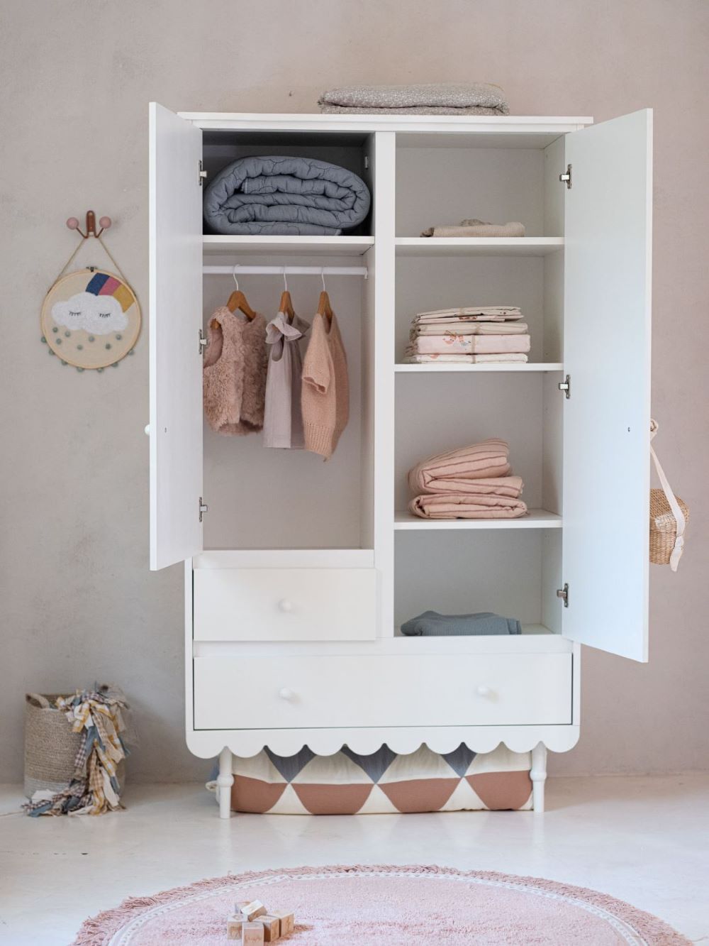 Biała szafa Babushka pomaga wygodnie zorganizować ubrania na wiele lat. W środku znajdują się: