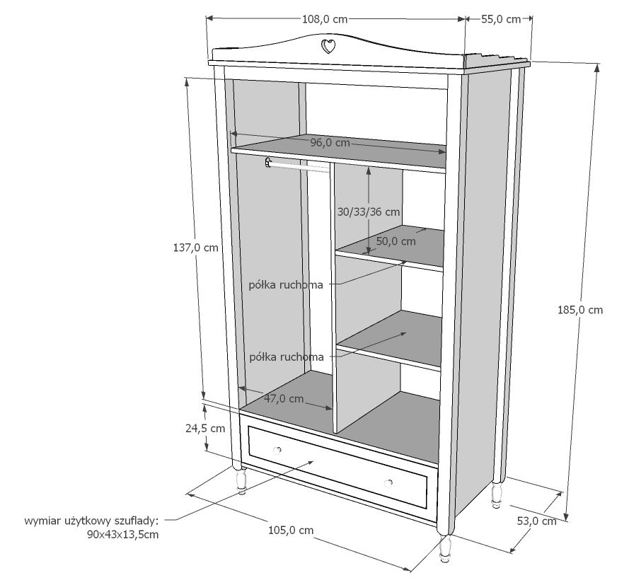 szczyt mebla zdobi dekor z wyfrezowanym serduszkiem,