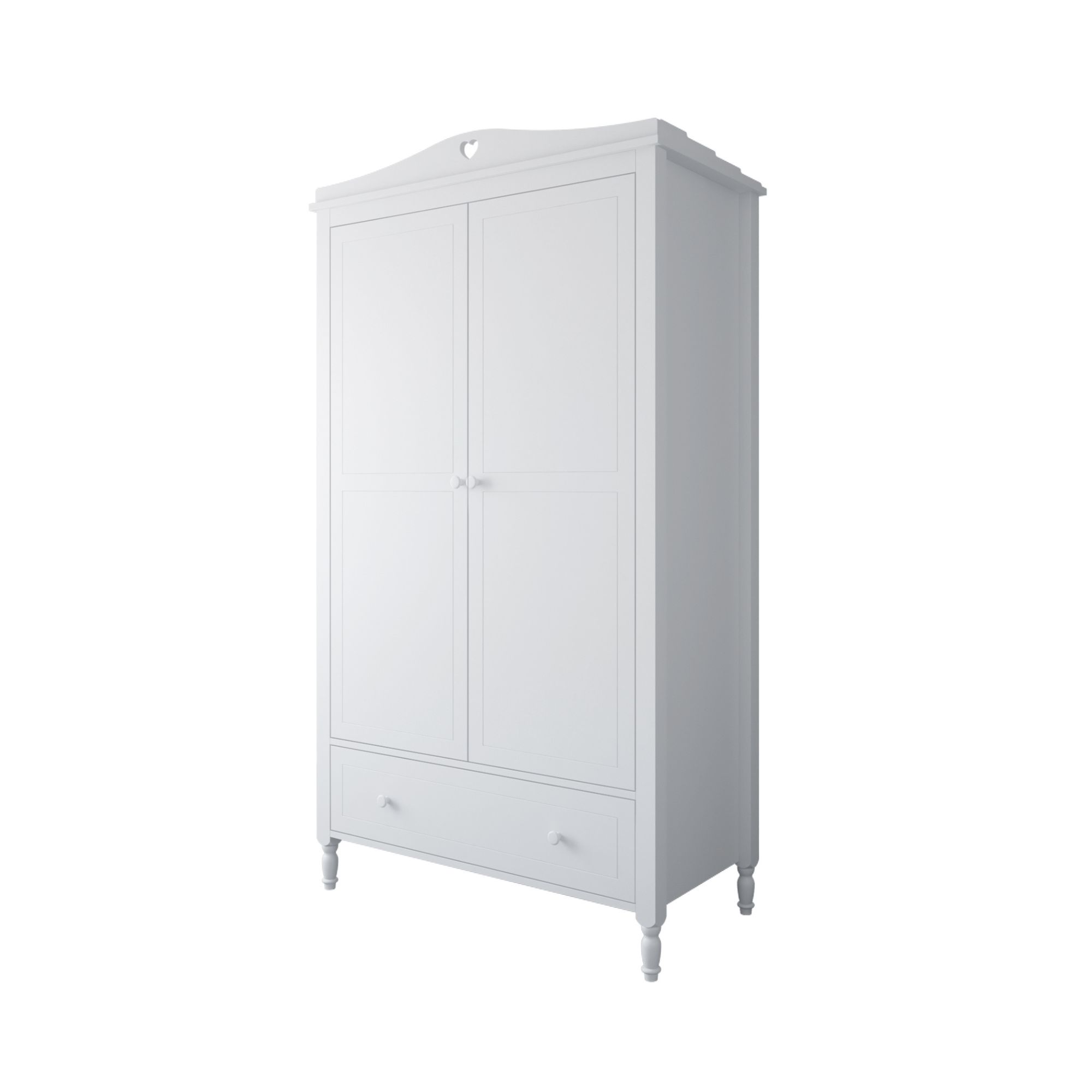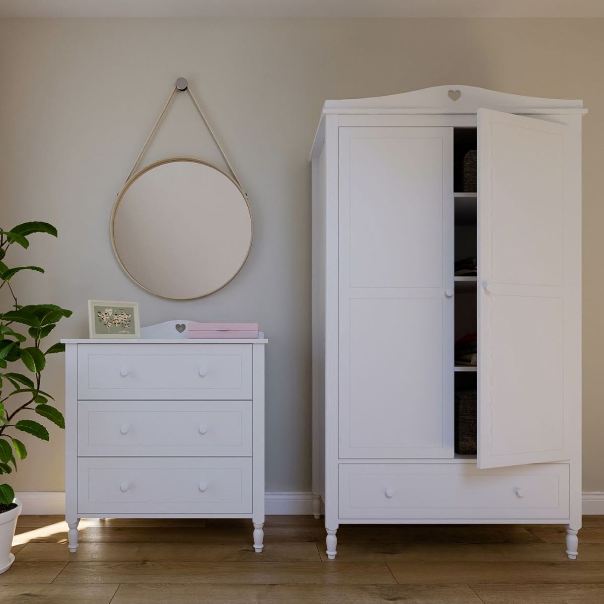 Szafa dla dziewczynki Bella to biała, dwudrzwiowa szafa z dekoracyjnym serduszkiem i toczonymi nóżkami, która od razu nadaje pokojowi dziewczęcemu romantyczny, lekki charakter. Delikatny frez na frontach, śnieżna biel i klasyczna forma sprawiają, że mebel pasuje zarówno do pastelowego pokoju małej księżniczki, jak i bardziej „dorosłej” aranżacji. Zobacz też inne meble dla dziewczynki z kolekcji Bella, aby stworzyć spójny, funkcjonalny pokój młodej damy.