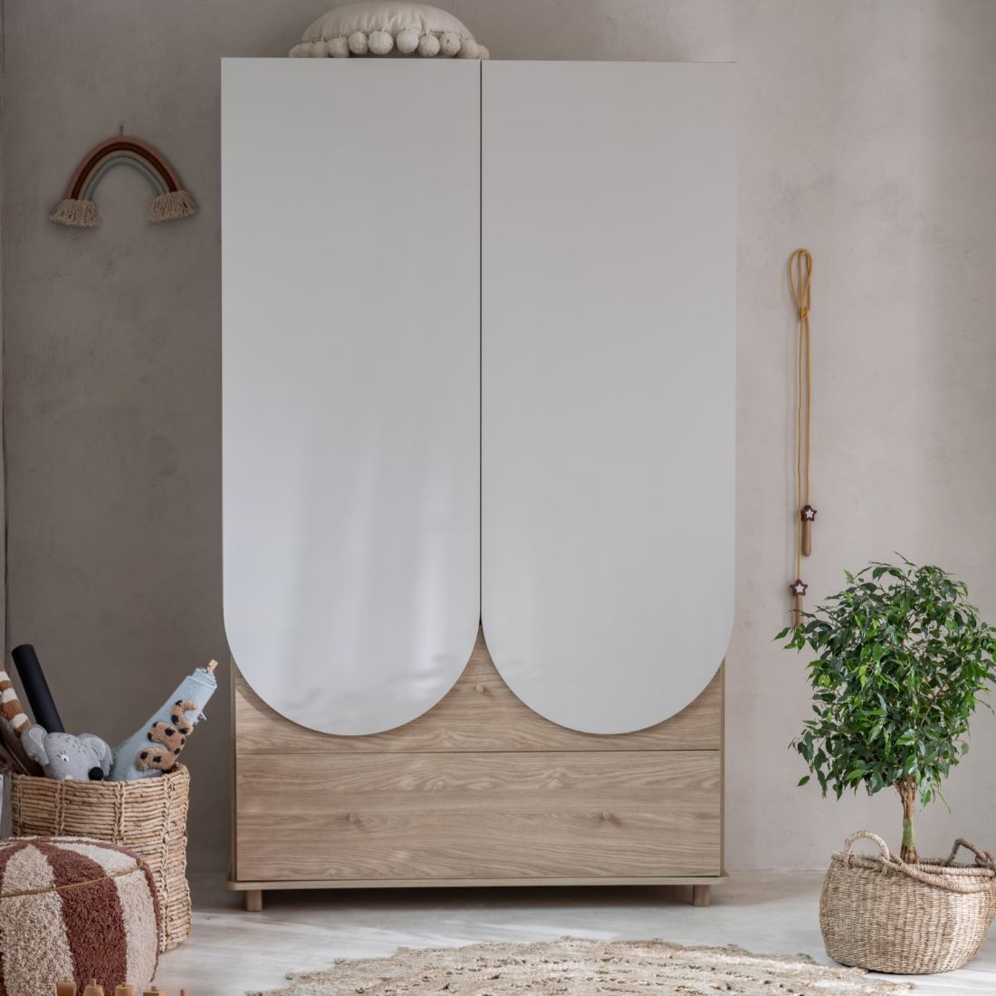 Wysoka szafa dziecięca Bloom to propozycja do pokoju, w którym naprawdę dużo się dzieje – i równie dużo trzeba pomieścić. Szerokość 120 cm, pełna wysokość oraz dwa duże fronty sprawiają, że to szafa, która sprawdzi się zarówno w pokoju jednego dziecka, jak i dzielonej przestrzeni rodzeństwa. Stonowane połączenie kaszmirowego MDF z dekorem dębu wpisuje się w spokojną, przytulną aranżację pokoju dziecięcego, a jednocześnie pasuje do innych mebli dziecięcych z kolekcji Bloom – łóżek, komody i regałów.