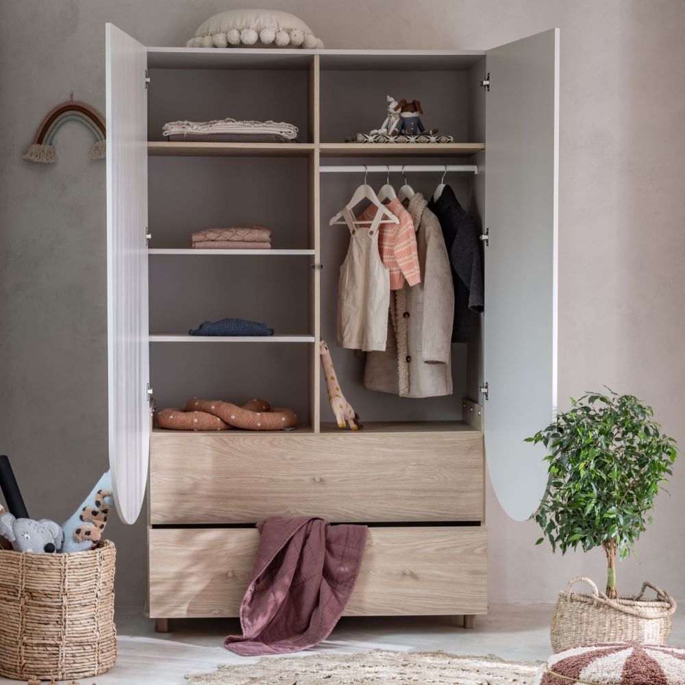 Ta wysoka szafa Bloom została zaprojektowana z myślą o dzieciach, które rosną, zmieniają styl i mają coraz więcej ubrań. Dzięki dużej szerokości łatwo zorganizować w niej garderobę w jednym miejscu – od ubranek przedszkolaka po stroje nastolatka.