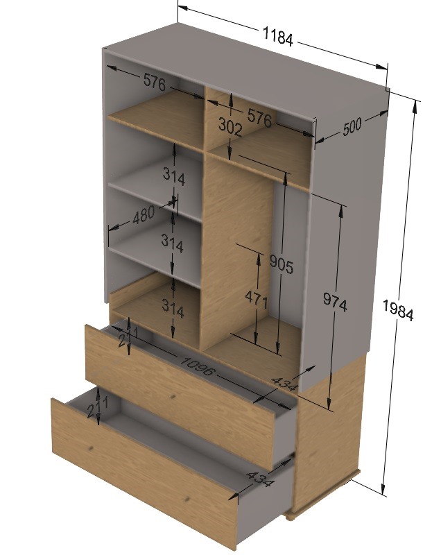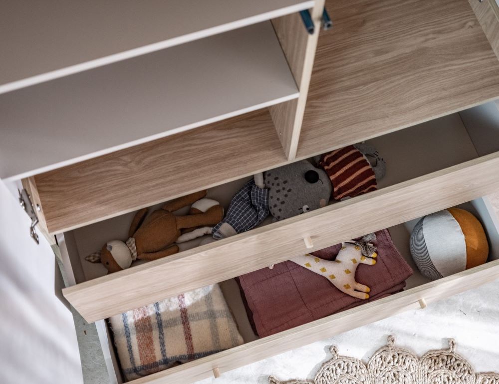 w dolnej części mebla umieszczono dwie szerokie szuflady na prowadnicach z samodomykiem, w których wygodnie schowasz piżamy, bieliznę, sportowe ubrania lub zabawki.