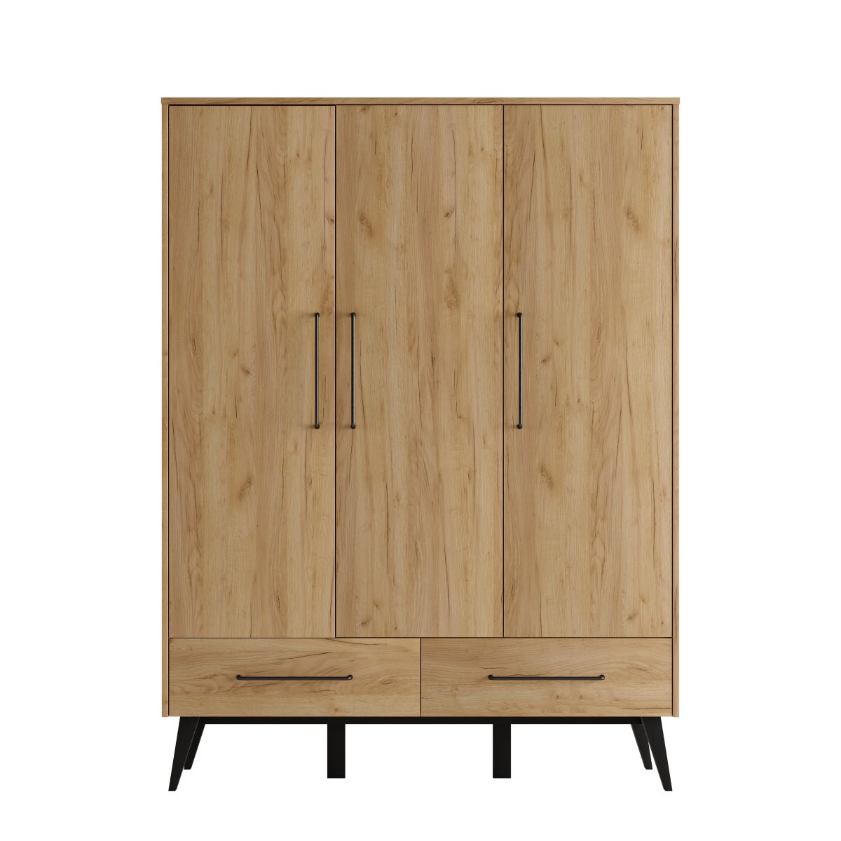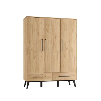 Szafa dziecięca trzydrzwiowa Retro to pojemny i funkcjonalny mebel do pokoju niemowlęcia, przedszkolaka i starszego dziecka. W środku wygodnie poukładasz ubrania na wieszakach i półkach, a na dole skorzystasz z dwóch dużych szuflad. Loftowo-skandynawski design, wysokie nogi z litego drewna bukowego i prosty, drewniany dekor pasują do pozostałych mebli z kolekcji Retro, dzięki czemu łatwo stworzysz spójny zestaw mebli dziecięcych.