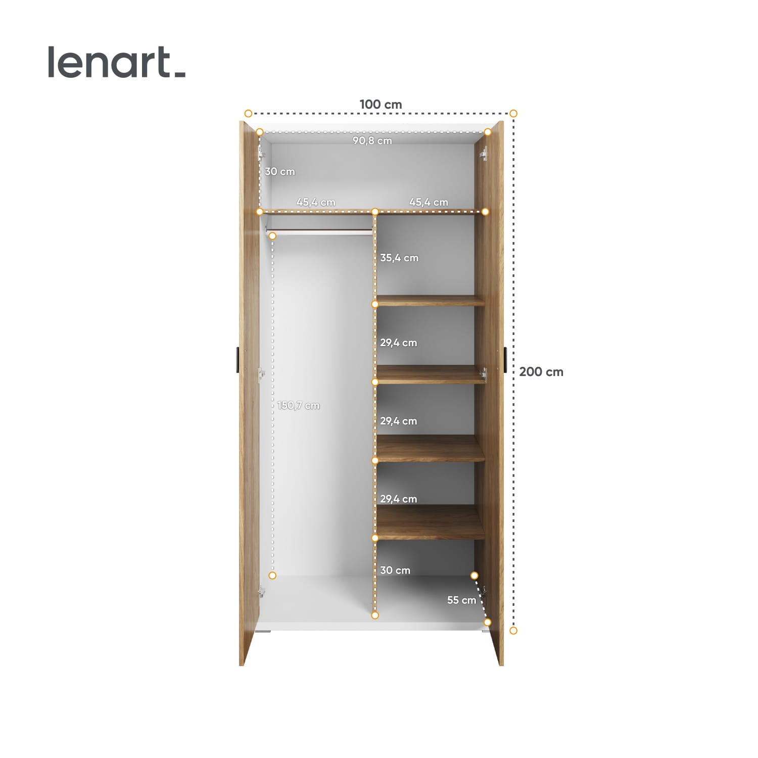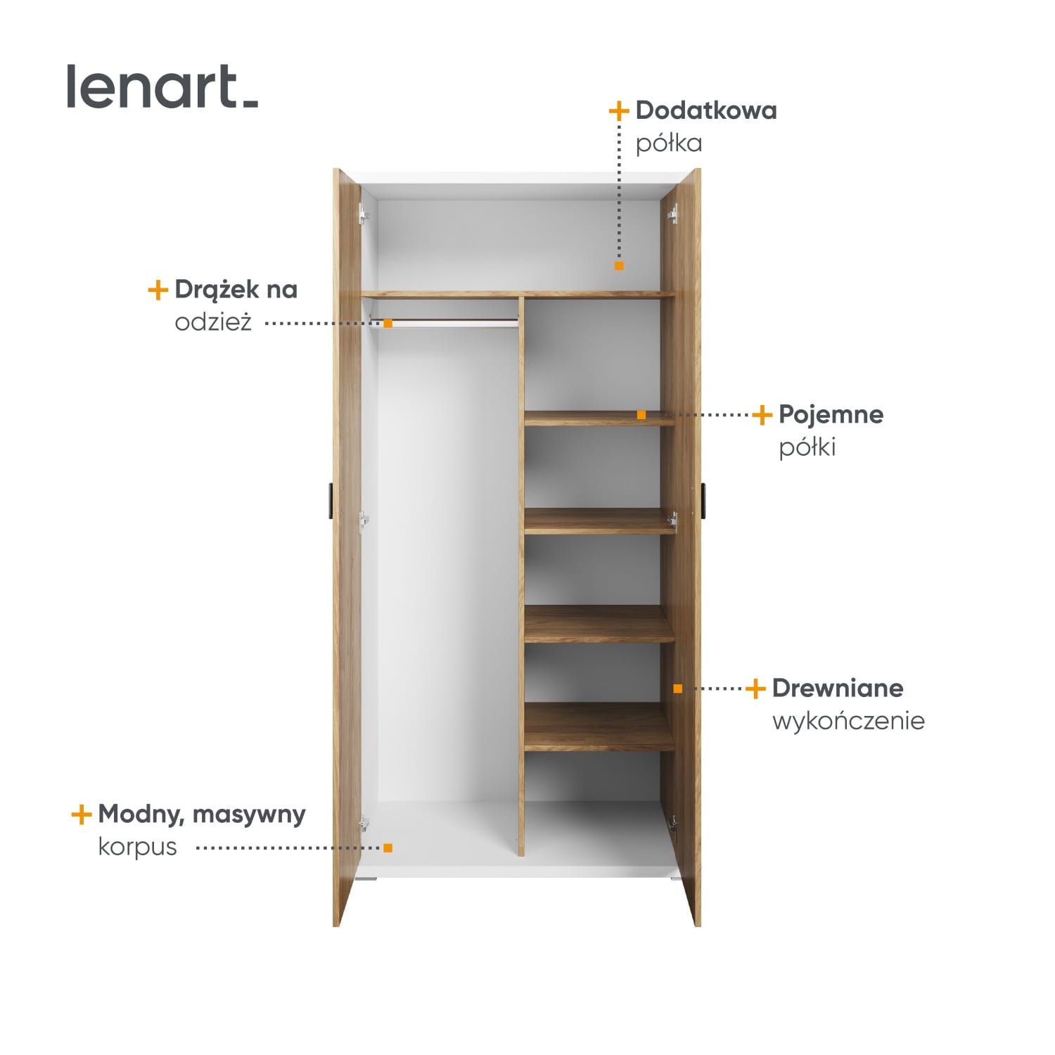 Pojemna szafa na ubranie z funkcjonalnym wnętrzem. Układ szafy przedzielono na pół, tworząc miejsce na wewnętrzny regał z półkami oraz drążek na odzież, na którym swobodnie zawiesisz ubrania o różnej długości. Dodatkowe miejsce do przechowywania znajduje się na wysokiej półce nad drążkiem oraz na dnie szafy.