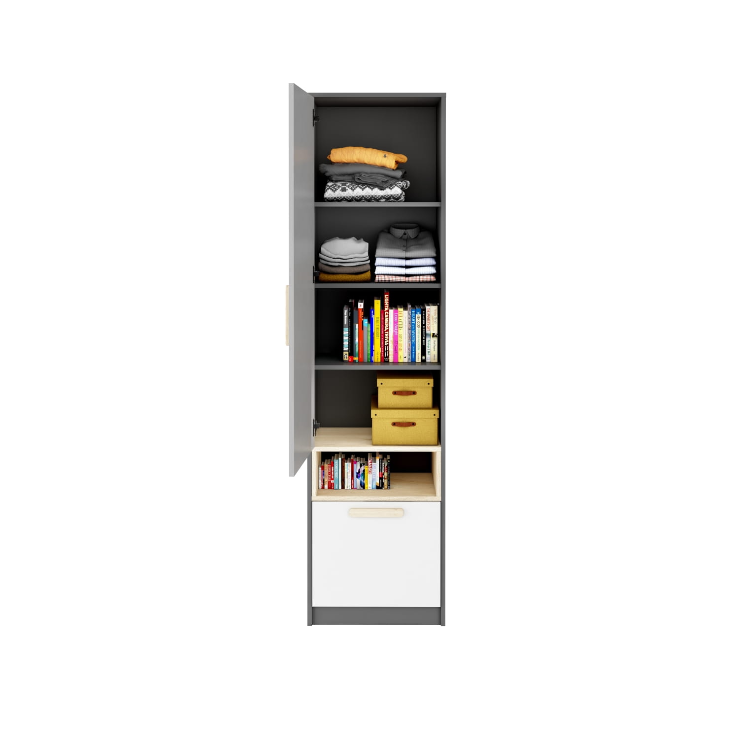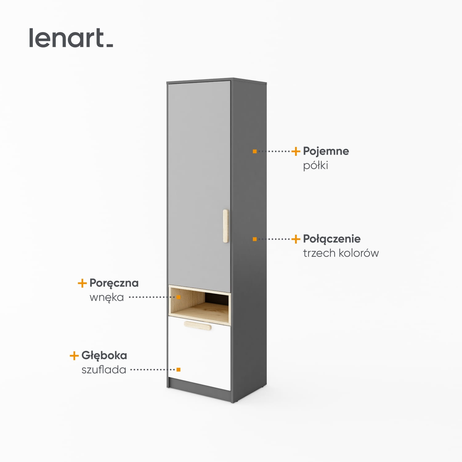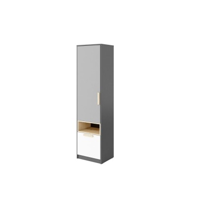 Kompaktowa w wymiarach, jednodrzwiowa szafa na odzież, zabawki i szkolne akcesoria. Wewnątrz znajdziesz pojemne półki i głęboką szufladę. Znalazło się też miejsce na przydatną wnękę na podręczne drobiazgi.