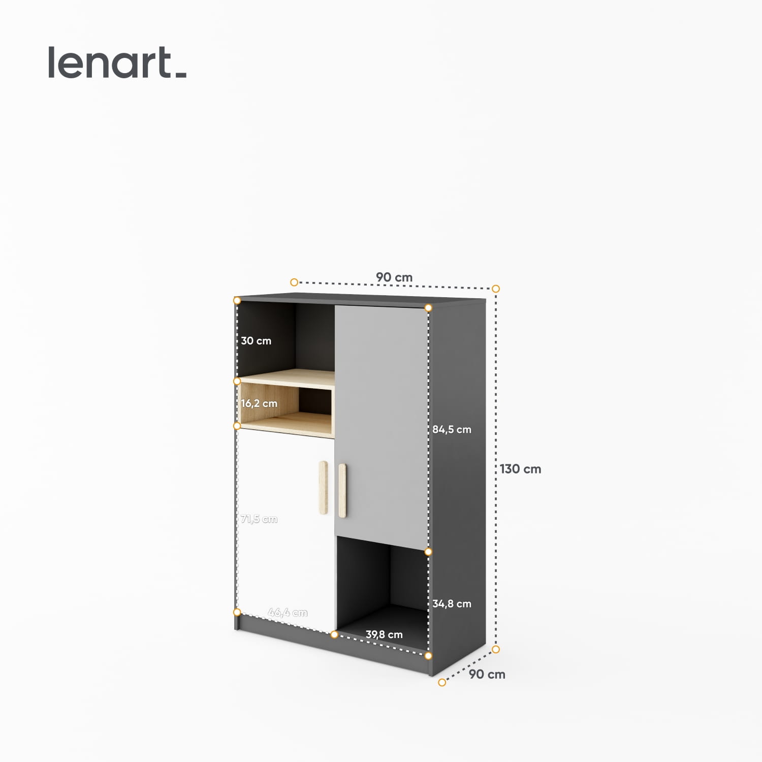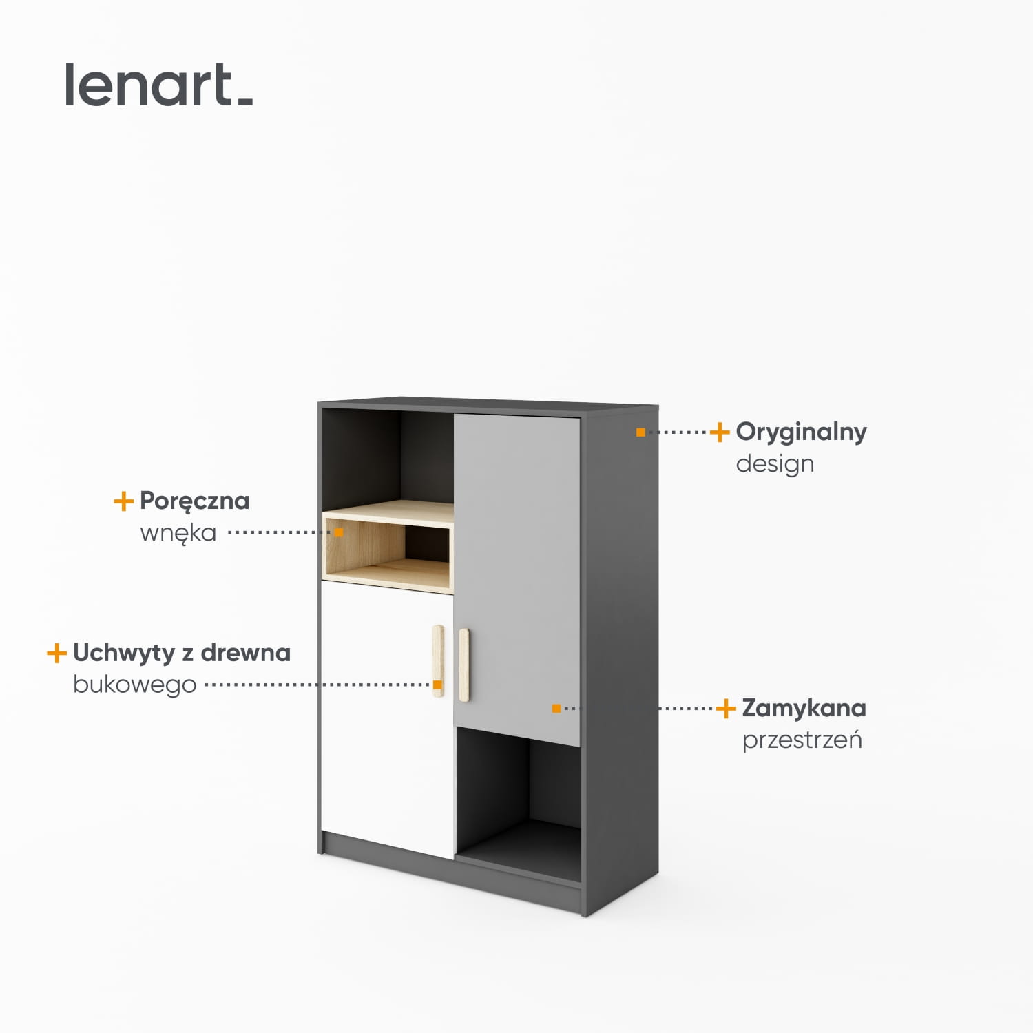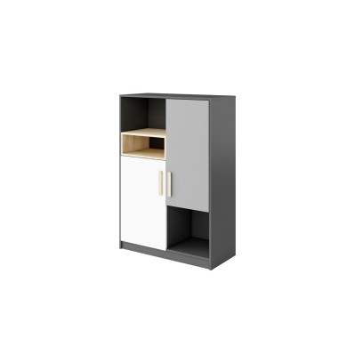 Szafka niska, która pozwala na wygodne rozmieszczenie najróżniejszych rzeczy. Posiada zamykaną przestrzeń do przechowywania odzieży i innych przedmiotów, których nie lubisz trzymać na wierzchu. Grafitowe półki to dobre miejsce na książki, również te wysokie typu atlasy i inne szkolne akcesoria. W niskiej wnęce, zaakcentowanej dekorem w kolorze drewna, możesz umieścić mniejsze rzeczy i dekoracje.