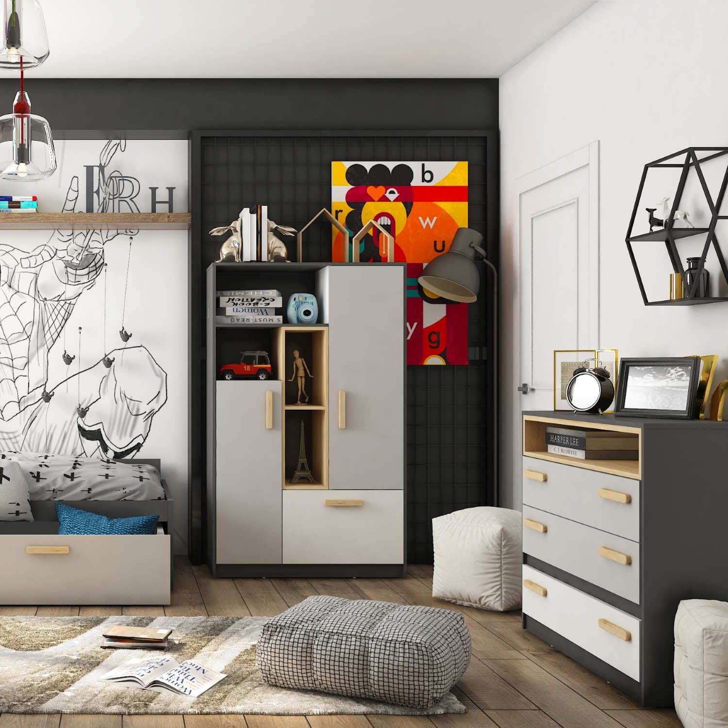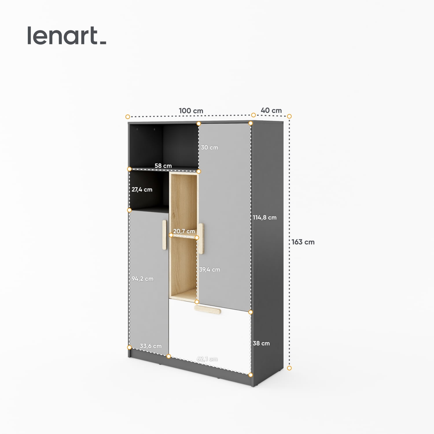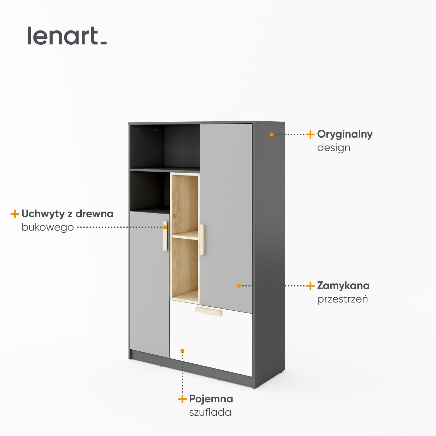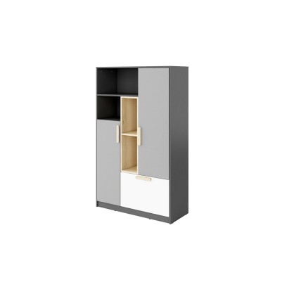 Szafka wysoka, która pozwala na wygodne rozmieszczenie najróżniejszych rzeczy. Posiada zamykaną przestrzeń do przechowywania odzieży i innych przedmiotów, których nie lubisz trzymać na wierzchu. Na dole znajduje się pojemna szuflada, np. na bieliznę lub inne drobiazgi. Grafitowe półki to dobre miejsce na książki lub szkolne akcesoria. W wysokich wnękach, zaakcentowanych dekorem w kolorze drewna, możesz umieścić teczki, segregatory, albumy lub wysokie książki.