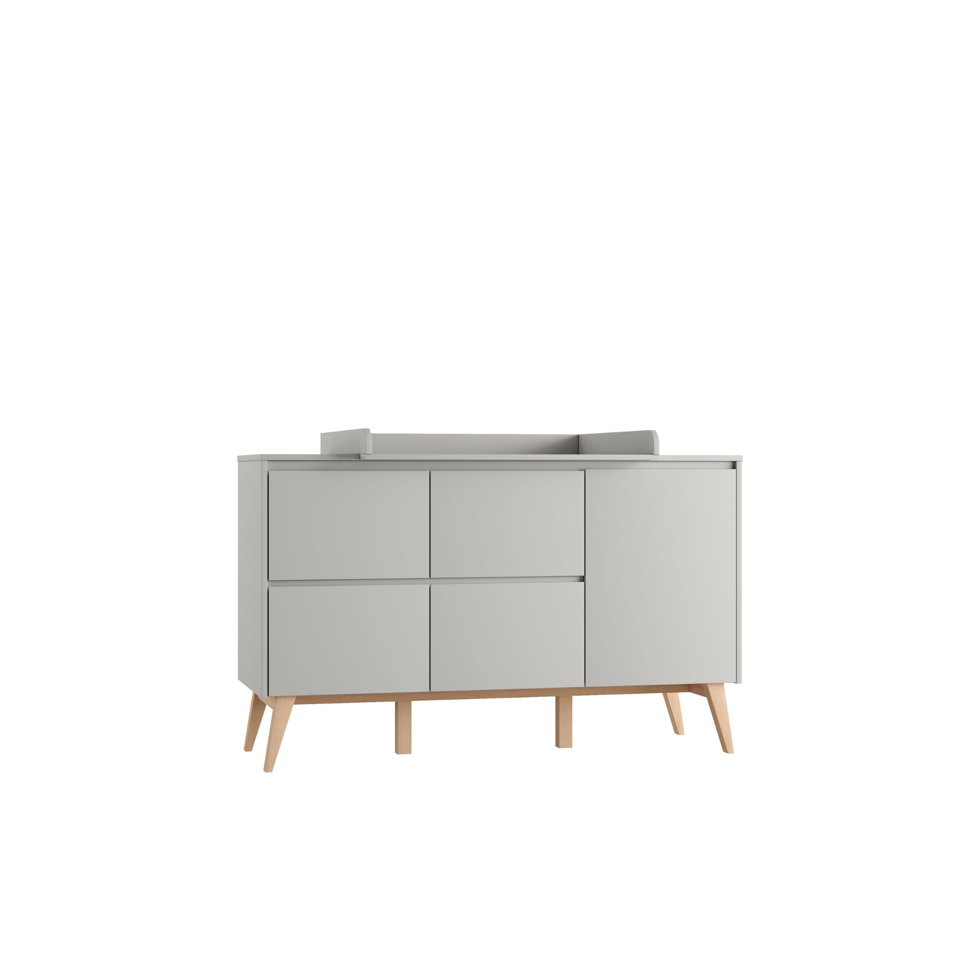 Komoda z przewijakiem Swing szara to funkcjonalny mebel 2w1 do pokoju niemowlaka lub małego dziecka. Łączy wygodną powierzchnię do przewijania z pakowną komodą w skandynawskim stylu. Stonowana, ciepła szarość frontów i drewniane nogi z buku idealnie pasują do spokojnych, naturalnych aranżacji oraz pozostałych mebli z kolekcji Swing.