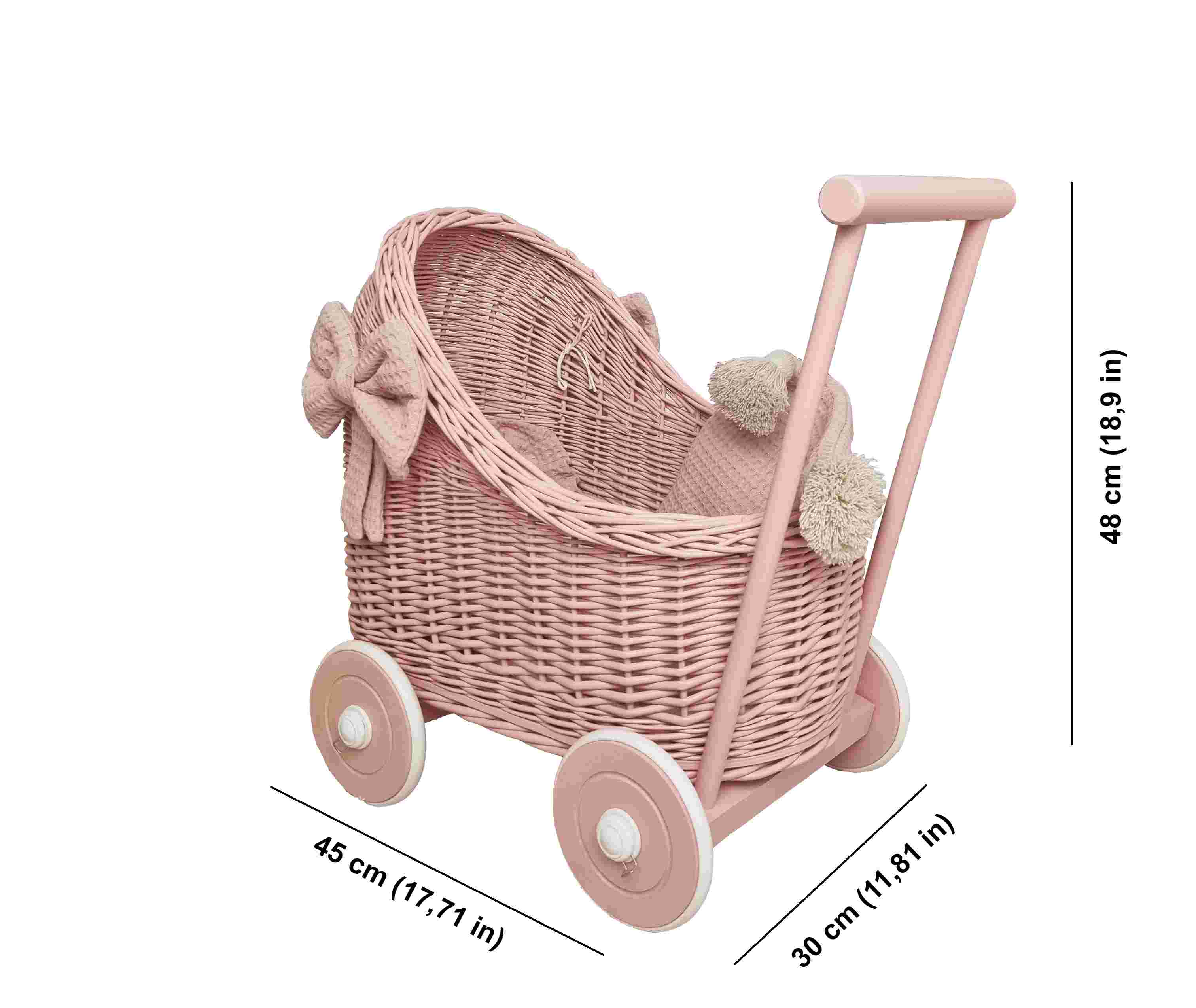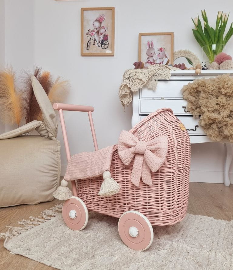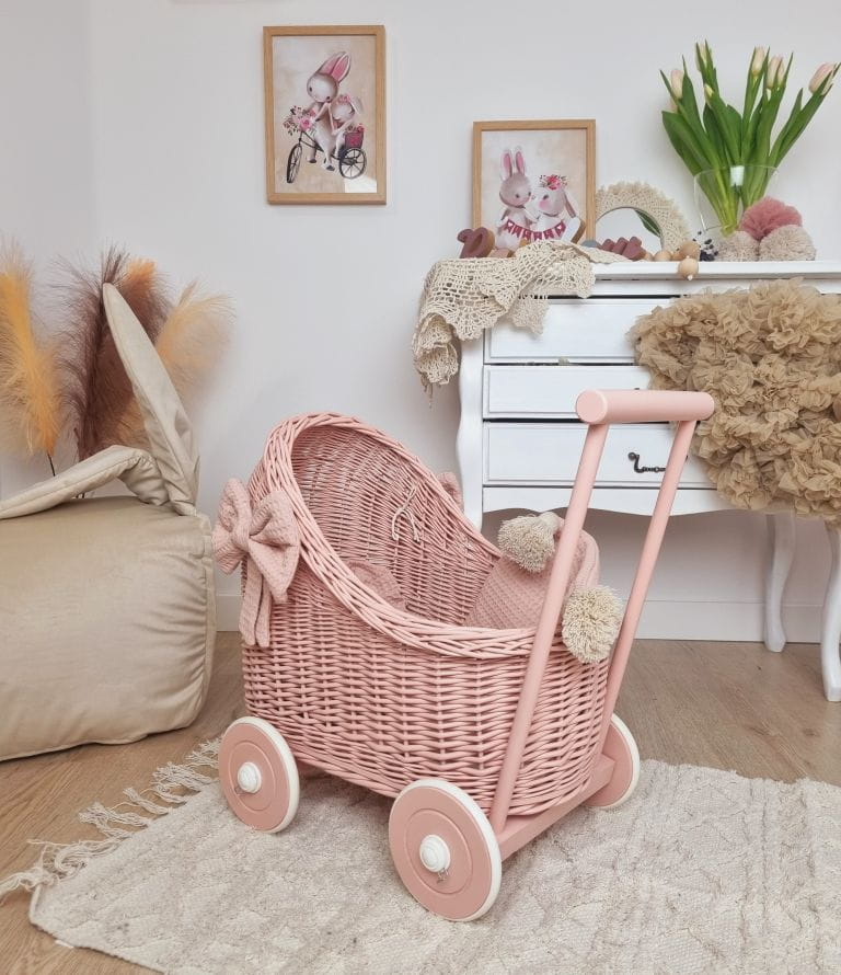 Śliczny, ręcznie wyplatany z wikliny wózek dla lalek dla 2 latki w modnym kolorze brudnego różu. Propozycja adresowana do wszystkich małych dziewczynek, które naśladując rodziców w opiece nad dzieckiem, chcą się troszczyć o swoje lalki i maskotki. Wózek dla lalek posiada stabilną drewnianą rączkę, która ułatwi dziecku jego pchanie i utrzymanie równowagi. Drewniane kółeczka powleczone są gumową oponką i mocowane na metalowej osi za pomocą systemu "click".