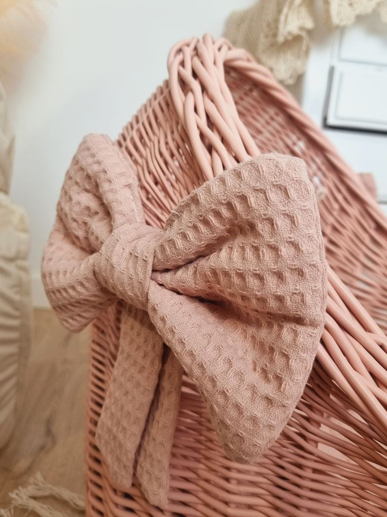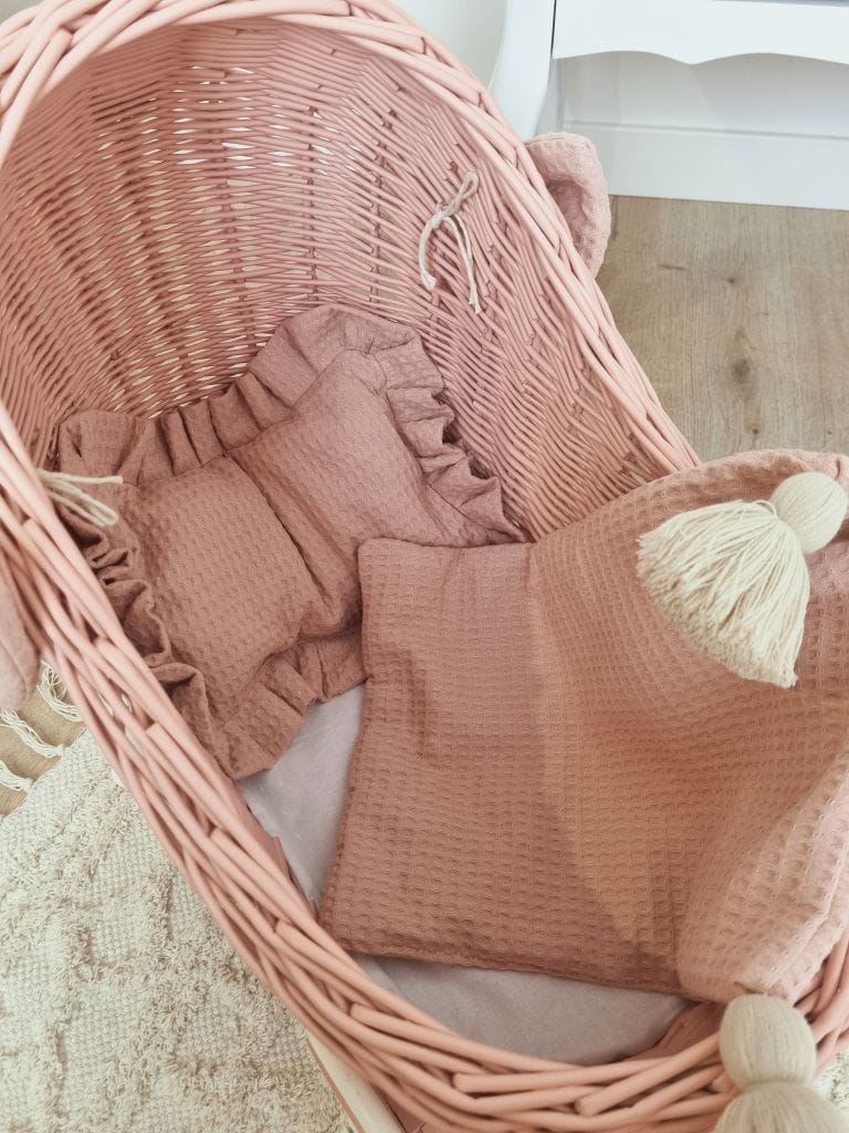 Wózek dla lalek dla 2 latki wymoszczony jest ręcznie wykonaną bawełnianą pościelą o strukturze wafla, również w kolorze brudnego różu. Poduszeczka wykończona jest falbanką, natomiast kołderka - dwoma chwostami w kolorze beżowym. Z tego samego materiału wykonana jest ozdobna kokarda mocowana na wózku. Całość tworzy piękną i wyjątkową kompozycję. Wózek dla lalek idealnie nadaje się na spacer do parku, po osiedlu czy do zabawy w domu. Ustawiony w pokoju dziewczynki stanie się równocześnie jego oryginalną ozdobą.