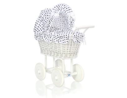 Wiklinowy kosz, ręcznie pleciony z dbałością o detale, zapewnia nie tylko piękny wygląd, ale również funkcjonalność. Kosz osadzony jest na solidnym, drewnianym, wysokim podwoziu z kołami, a rączka ułatwia prowadzenie i zapewnia stabilność. W zestawie znajduje się mięciutka pościel, składająca się z becika ozdobionego falbanką z delikatną lamówką, dzięki czemu lalka może wygodnie i stylowo „spać”. Wnętrze wózka wyściełane jest bawełnianą tkaniną, również wykończoną falbanką, co dodaje mu subtelnego uroku. Na uwagę zasługuje także ruchoma budka, ozdobiona delikatnymi kokardkami z materiału, nadając wózkowi jeszcze bardziej eleganckiego charakteru.